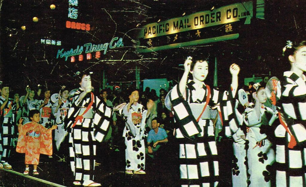 The Civic Center expanded into Little Tokyo in the 1950s, knocking down businesses and homes that were replaced with large municipal buildings and their attendant surface parking lots. a stretch of older buildings was spared from redevelopment and the sidewalks in front of them indicate the names of their historic tenants. turn south at the iconic, towering yagura and stroll through the blissfully car-free Japanese Village Plaza, created in 1978. All of Little Tokyo is charming, so I have designed a winding path in order to take in sites like Little Tokyo Towers, Higashi Honganji, Zensushi Soto, St. Francis Xavier Church, and Hompa Hongwanji. Of course, there are many Japanese establishments at which to dine, drink, or pick up souvenirs along the way. Each of the temples celebrated O-Bon, which is a fun time to be in Little Tokyo — as is during the Annual Nisei Week Festival & the Grand Parade, all of which usually take place around August.