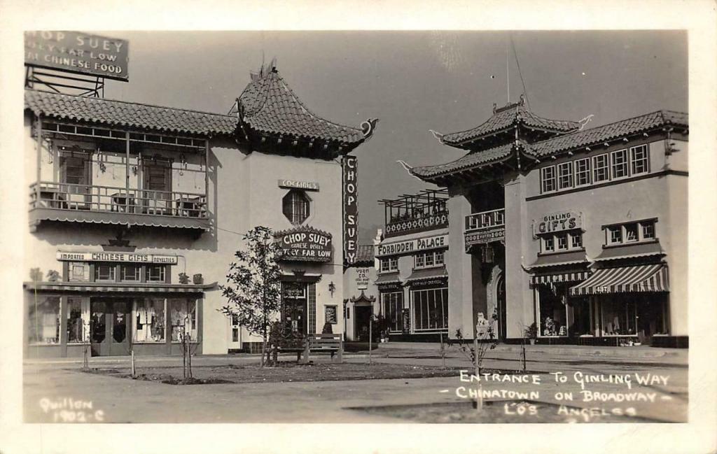 Old Chinatown, too, was demolished. It was demolished in order to make way for the construction of Union Station and the Hollywood Freeway. After her makeover of Olvera Street, Christine Sterling opened China City on 6 June 1938. Herbert Lapham and Peter Soo Hoo‘s New Chinatown development, centered around Chinatown Central Plaza, opened nearby on 25 June 1938. Both were located in what until then had been Little Italy. China City didn’t last nearly as long as Olvera Street. After a fire broke out on 20 February 1939, most of China City’s vendors relocated to New Chinatown. An arson fire completely destroyed China City in 1949 and the site was razed in 1955. Central Plaza, largely built with leftover bits of Hollywood props and film sets from 1937’s The Good Earth, looks much the same today as it did then — to the apparent bewilderment of some Chinese tourists. A winding path through Chinatown that incorporates Central Plaza and, across the street, Chungking Road, is a good way to see a lot of Chinatown. Chinatown hosts a lot of events, including Chinatown Summer Nights, Lunar New Year, and the L.A. Chinatown Firecracker Run.