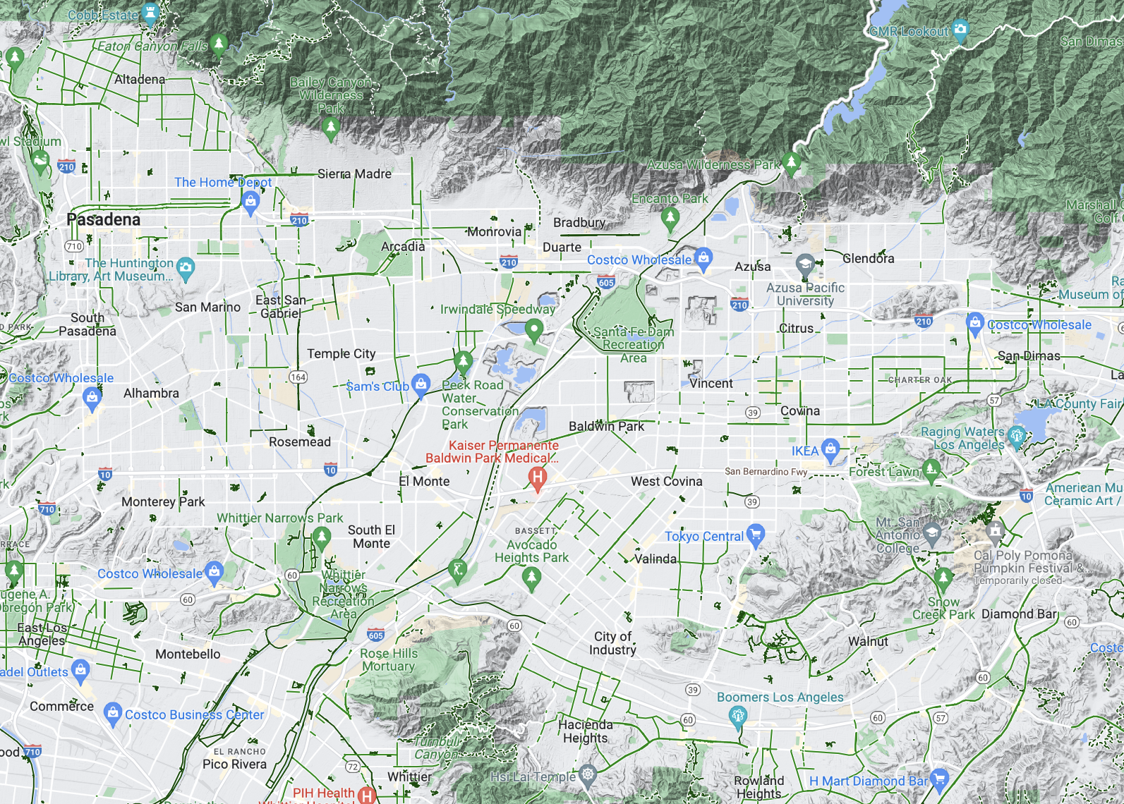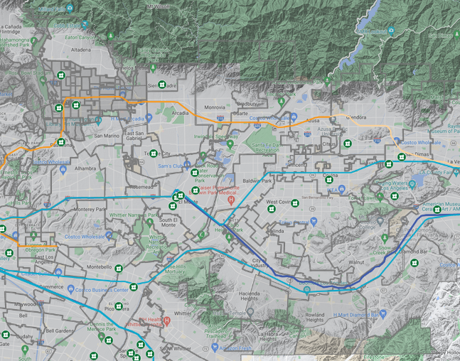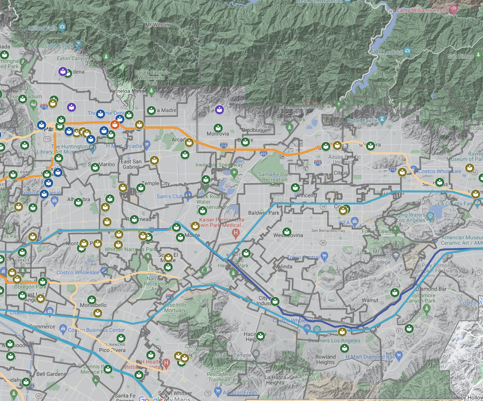 The San Gabriel Valley is home to roughly 1.8 million people — about the same as live in the San Fernando Valley. If either were a single city they would become the fifth most populous in the US (overtaking Phoenix) and the second most populous in California, after Los Angeles. The San Gabriel Valley, though, is home to 26 cities: Alhambra, Arcadia, Azusa, Baldwin Park, Bradbury, Covina, Diamond Bar, Duarte, El Monte, Glendora, Industry, Irwindale, La Puente, Monrovia, Monterey Park, Pasadena, Rosemead, San Dimas, San Gabriel, San Marino, Sierra Madre, South El Monte, South Pasadena, Temple City, Walnut, West Covina. The San Gabriel Valley is also home to 26 unincorporated communities: Altadena, Avocado Heights, Azusa Islands, Bassett, Charter Oak, Citrus, Covina Islands, East Azusa, East Pasadena, East San Gabriel, Glendora Islands, Hacienda Heights, Kinneloa Mesa, Mayflower Village, North El Monte, Ramona, Rowland Heights, San Pasqual, South Monrovia Island, South San Gabriel, South San Jose Hills, Unincorporated Azusa, Unincorporated Glendora, Vincent, West Puente Valley, and Valinda. There are also two large unincorporated areas that can’t really be described as communities — or at least not human ones — South Diamond Bar and Whittier Narrows.