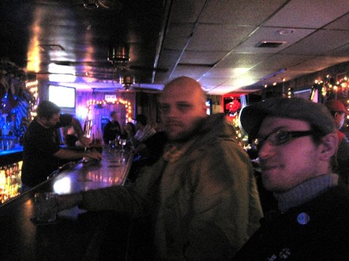 An appropriately blurry photo of Lars and Tim in the Station from a Rock & Roll Mondays in 2008