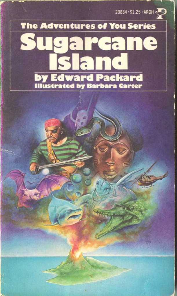 The first modern gamebook, certainly the most influential, was Packard’s Sugarcane Island, written in 1969. Packard was born in Huntington, New York in 1931. He was a graduate of Princeton University and Columbia Law School. He submitted his gamebook to several publishers in 1969 and ’70 but none showed sufficient interest. In 1972, however, a series of game books called Tracker Books was inaugurated with the publication of Mission to Planet L. It was followed by Dungeons & Dragons, first published in 1974, which popularized fantasy role-playing games. In 1976, Will Crowther programmed the first text-based computer game, Adventure (albeit originally titled ADVENT because filenames were limited then to just six characters). Vermont Crossroads Press (co-owned by wife and husband team Constance Cappel and Raymond Almiran “R.A.” Montgomery, Jr) decided to publish Sugarcane Island, which they did on 23 June 1976. The first, hardcover printing was subtitled The Adventures of You Series. In 1977, they began subtitling Packard’s follow-ups “Choose Your Own Adventure.”