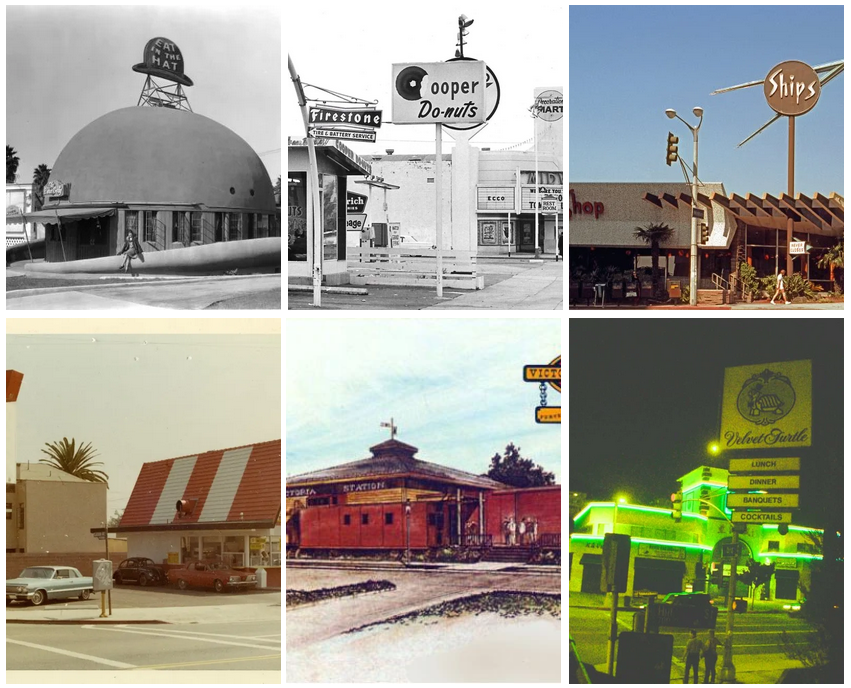 Dinah’s began with three locations that were opened by a group of golf buddies but operated independently of one another, for the most part. The Culver City location was more of a coffee shop. The Glendale location, founded by Canadian immigrant David Pearson in 1967, was (and is) more of a fried chicken stand. Eventually, six other chicken stands opened. The last, in Burbank, closed around 1997. The Westchester location, billed as a “family restaurant,” opened in 1957. A new development is incorporating the Googie-style architecture but construction required that Dinah’s vacate the space. They announced, in October 2022, that they may not return. To keep abreast of developments, follow the Los Angeles Conservancy’s coverage here.