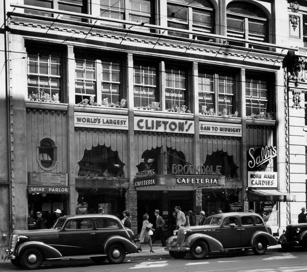 The last location of Clifton’s has operated — somewhat shakily in recent years — in the Broadway Theater District since 1935. At its peak, there were eight locations of the cafeteria chain. It was founded by Clifford Clinton, who created the restaurant’s name by combining his given and family names. His family had a fairly long track record in the restaurant business. Clinton’s parents, Edmond and Gertrude, co-owned a chain in San Francisco called Dennets. His grandfather, David Harrison Clinton, had operated the dining room at the Southern Hotel in Los Angeles.