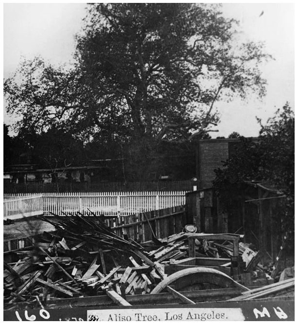 In 1781, a group of 44 pobladores established El Pueblo De Nuestra Señora La Reina De Los Ángeles De Pornicula at what’s now the neighborhood of El Pueblo. Its location chosen in compliance with a body of laws known as the Leyes de las Indias. It was sufficiently inland to protect it from pirates, located near a water source (the Los Angeles River), and was located near a Tongva village, Yaangna, whose inhabitants could be used as a labor force. Yaangna’s location was marked by a large, sacred sycamore tree, known to the Spanish as El Aliso. Its location is marked by a plaque in the sidewalk at the intersection of Commercial and Vignes streets, the latter a reference to a vineyard it later loomed over, and between a freeway and a cannabis dispensary. When the Philadelphia Brewery opened there in 1875, it stood in the courtyard. It was chopped down and used for lumber when the brewery was expanded.
