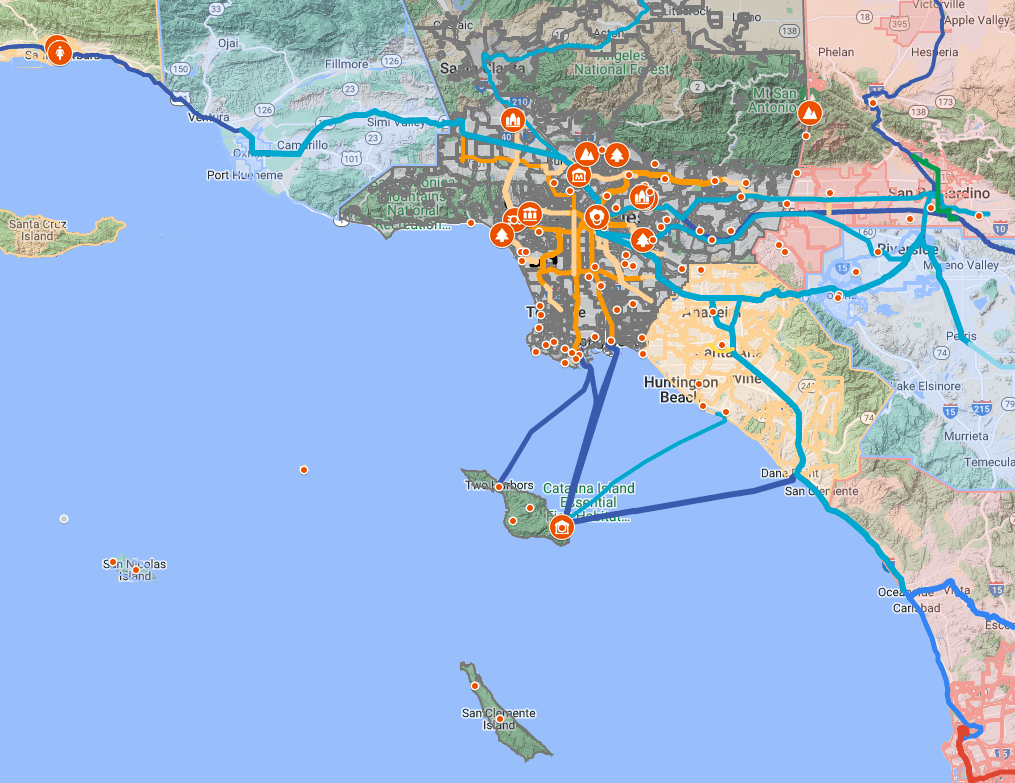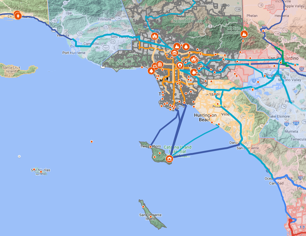 Los Angeles, of course, didn’t exist until 1781 CE, by which time the Tongva themselves had lived in the region for thousands of years. But even though the Tongva were amongst the first people encountered by the Spanish, when they arrived in what’s now Los Angeles — it’s wrong (and a little insulting) to assume either that things had pretty much just existed in stasis for the more than 13,000 years of human history in the area that led up to that day, nobly and gently stewarding the land in their prelapsarian paradise. People moved vast distances. There was war and peace. Cultures arose, absorbed, interacted, and evolved. Huge cities rose and fell. Neither the city nor county of Los Angeles corresponds very closely with the territories of any non-European people who lived there at any point in history. It was, as it still is, a dynamic place.