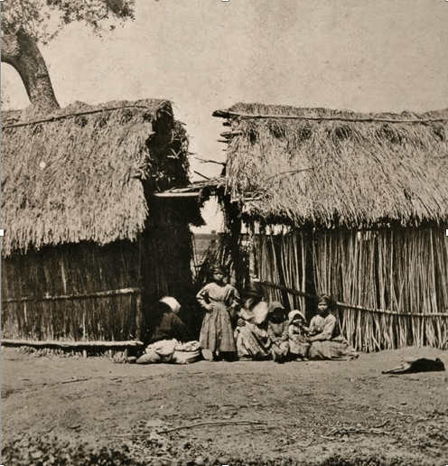Gabrieleño women and children in front of their dwelling and attached hut on the L.J. Rose property, in Sunny Slope. Photo by Carleton E. Watkins, c. 1877
