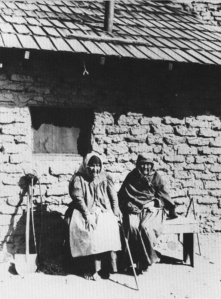 Two Tongva women sitting outside of adobe at San Fernando Mission, c.189