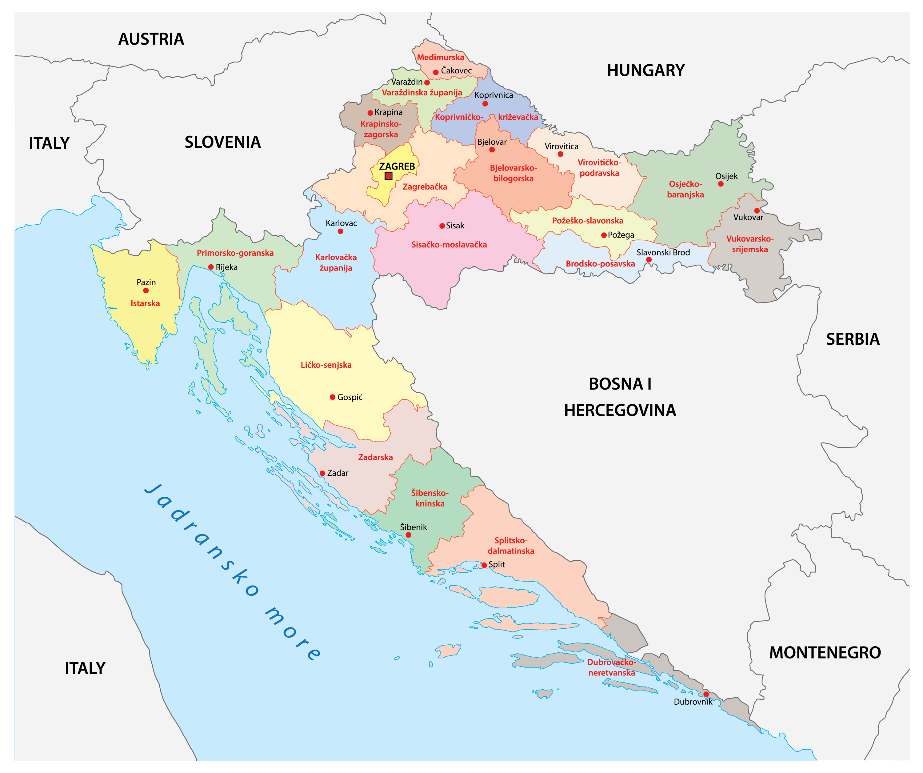 Croatia (Croatian: Hrvatska) is a small country in Europe located on the Adriatic. Its neighbors are Bosnia and Herzegovina, Hungary, Montenegro, Serbia, and Slovenia. It shares a maritime border with Italy. Its capital and largest city is Zagreb. Croatia’s population, at 3.899 million, is almost exactly the same as that of the City of Los Angeles — 3.849 million. The country is slightly larger than San Bernardino County.