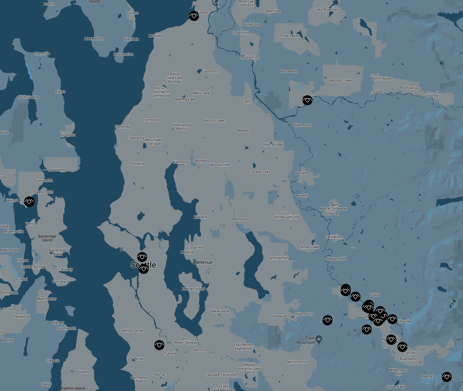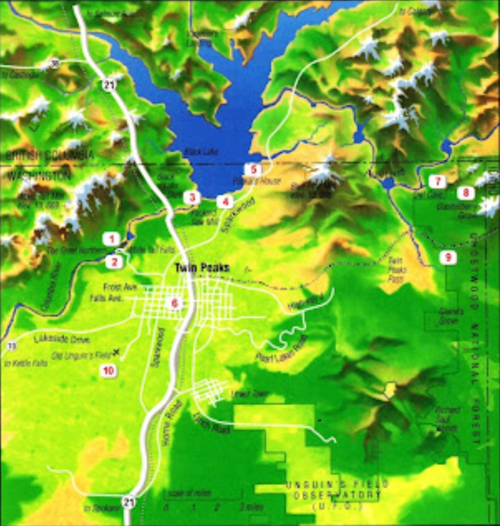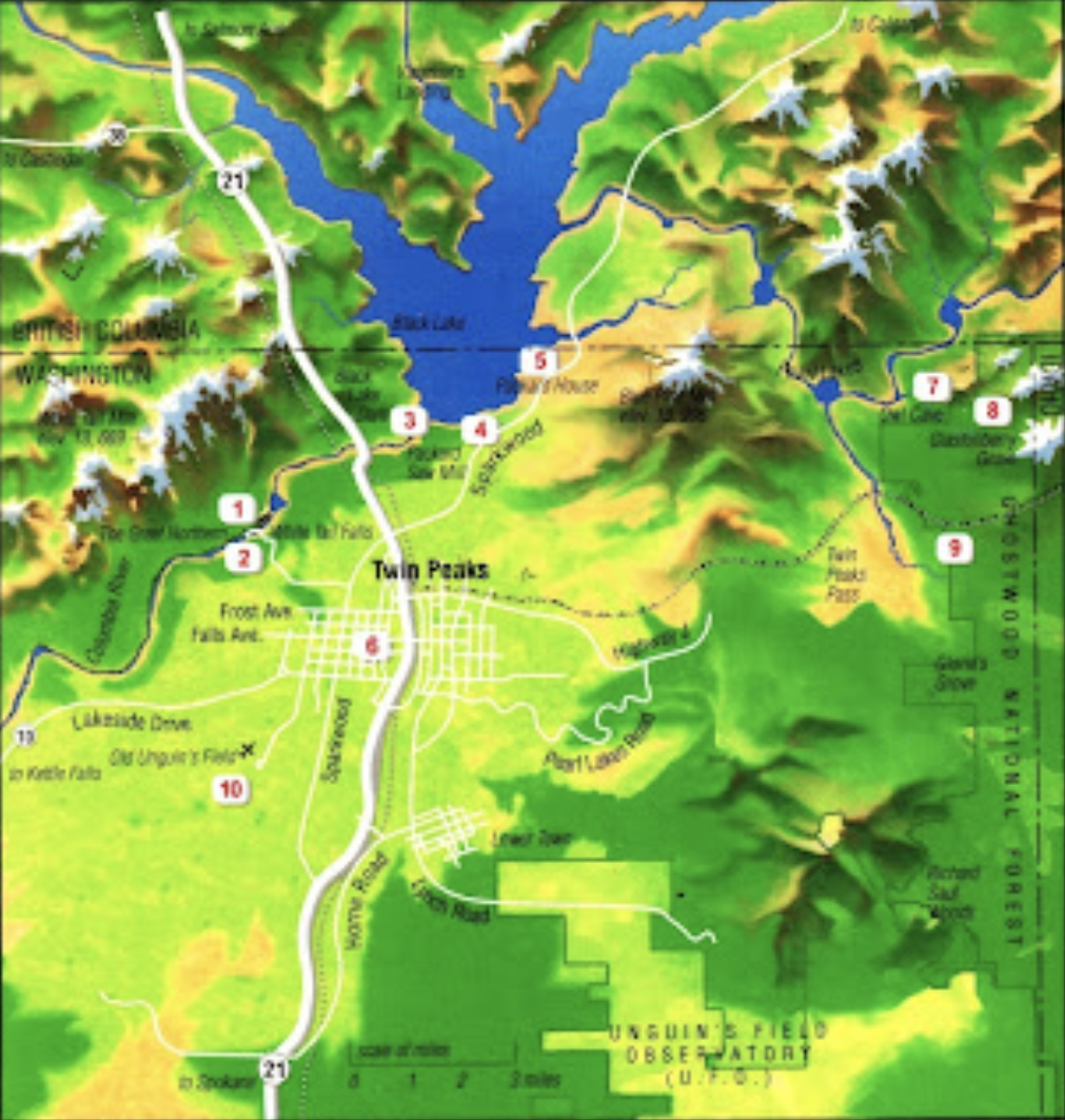 Happy Twin Peaks Day! It was on this date, 24 February, back in 1989 that FBI Agent Dale Cooper first rolled into Twin Peaks, a Washington town located “five miles south of the Canadian border, and twelve miles west of the [Idaho] state line.” The time was 11:30 am. Twin Peaks, of course, is a fictional place and the coordinates provided by Coop would place it Pend Oreille County, very near the town of Metaline Falls. In reality, the series, Twin Peaks, was mostly filmed in central King County, Washington — primarily in the towns of Fall City, North Bend, Spring Bend, and especially Snoqualmie. Filming also took place in Seattle and Los Angeles. I’ve attempted to map as many locations as possible from Twin Peaks, Twin Peaks: Fire Walk With Me, and Twin Peaks: The Return, here. And here’s a great collection of other Twin Peaks Maps, from the Welcome to Twin Peaks website.