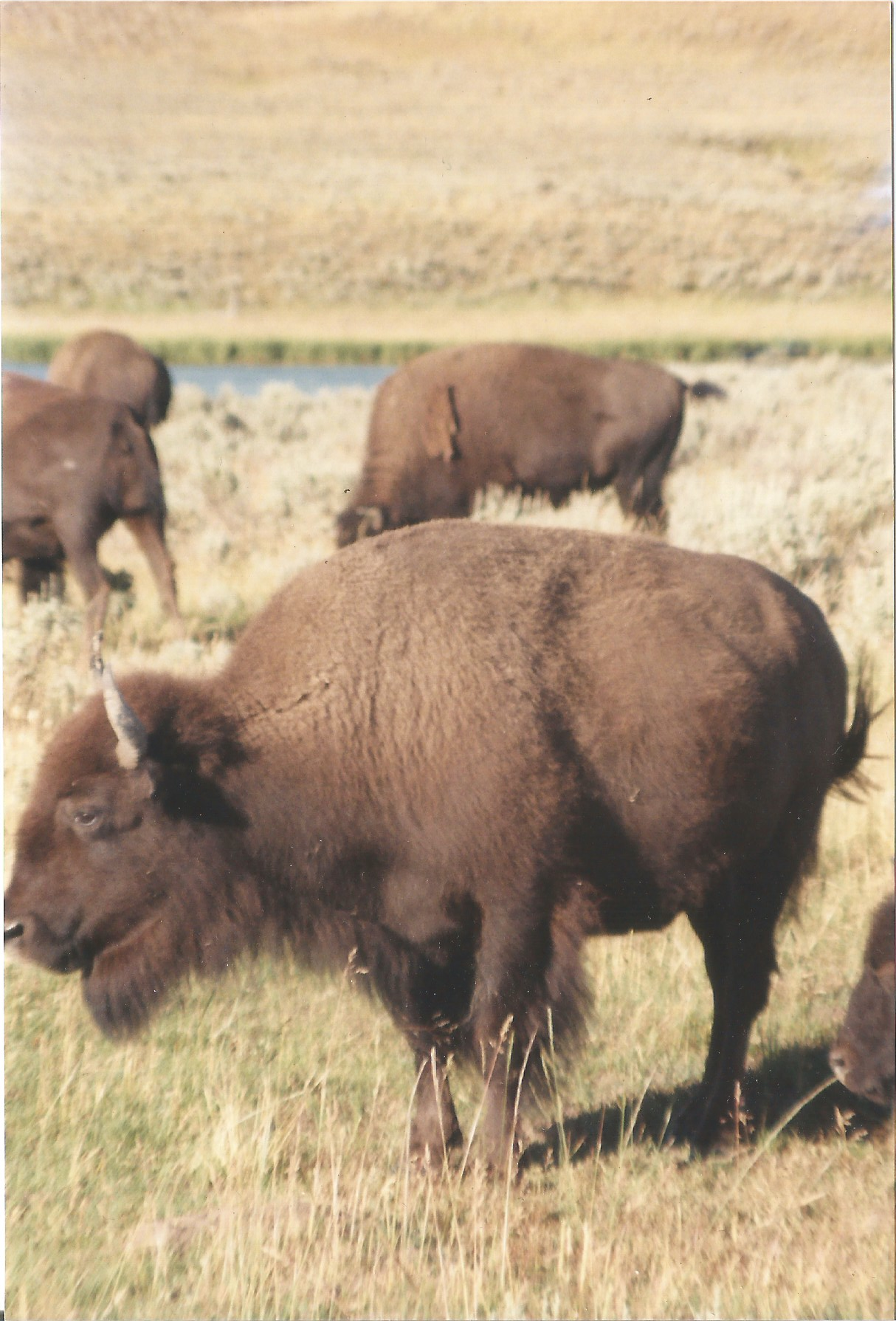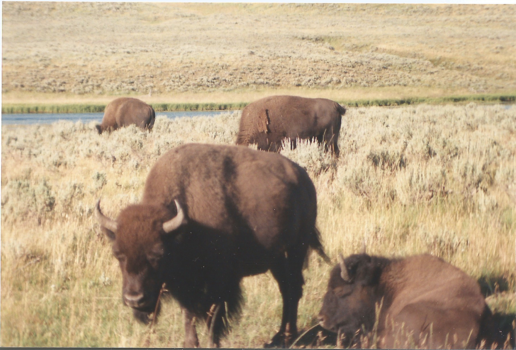 We drove on to Cody, where we stopped for sandwiches — I think at the Breadboard. After that, we headed back into the mountains — this time, the Absaroka Range. Yellowstone was every bit as beautiful as you’re led to believe. There’s a stunning array of vistas, wildlife, and views. We saw elk and bison and sulfur springs. Like good tourists, we visited Old Faithful. Imagine visiting Yellowstone and not.