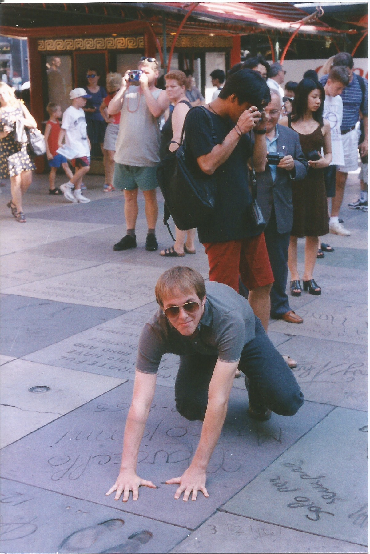Our next stop was the Chinese Theatre — which is better than the Walk of Fame or The Ovation, because it is a beautiful cinema, designed by Meyer & Holler. Meyer & Holler also designed the beautiful Egyptian Theater — which we didn’t visit, I assume, because the main draw for most visitors isn’t Exotic Revival cinema architecture but hand prints, foot prints, and signatures made by slebs like Elmer C. Rhoden, Private Joe Brain, Rosa Grauman, or William F. “Bill” Hertz. I scoured the concrete and found a film star I liked and found Marcello Mastroianni. I duly placed my hands into his prints for an unflattering photo. I enquired about the Pig ‘n Whistle — because the name reminded me of the Wig & Pen. Seth assured me that it was nothing special.