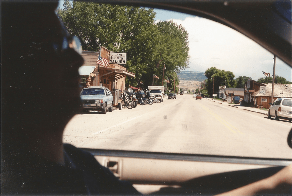 The ranchers welcomed me inside. I explained the situation. Without hesitation — or consulting a phone book — one of the ranchers called the mechanic. He wasn’t at the shop. It was a Sunday and a bit late in the day by this point. They invited me to stay for supper. They were making peach cobbler for desert and it smelled amazing. I told them that as much as I’d truly have loved to, my traveling companion didn’t do dogs and so we’d have to soldier on, cobbler-less. I trudged back down the driveway toward Seth and the Taurus and filled him in. We then walked a short distance down the highway toward a very small town called Ten Sleep — so known, supposedly, because it was, according to the country’s indigenous people, ten “sleeps” from anywhere else of note. The sign at the edge of informed us that the elevation was 4206 feet and the population about 323. One of us joked that we should take a piece of chalk and adjust it to 325.