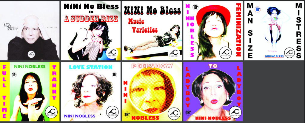Around 2008, Denis began to record and perform new material as No Bless — a play, seemingly, on “noblesse” and — according to some — “knob-less,” a reference to her gender affirmation surgery. They were apparently rather fond of blunt humor and unconcerned with using consistent names, pronouns, terminology, or, for that matter, spelling and punctuation. That year, they released All Night Long, attributed to No Bless. By the time Man Size Mistress was released, she was using the pronoun, “she,” but still crediting herself as “ex Denis J Le Page.” Music Varieties was credited to Nini Nobless and the liner notes wait that she was a  hermaphodite [sic] undergoing the process of “feminizing.” She futurer billed herself as a “one tranny band” and released the album, Full Time Tranny