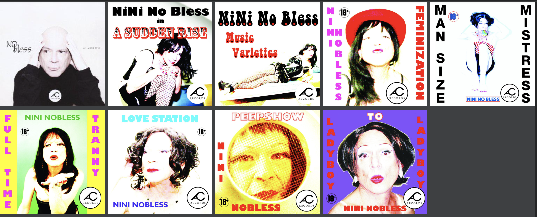 Around 2008, Denis began to record and perform new material as No Bless — a play, seemingly, on “noblesse” and — according to some — “knob-less,” a reference to her gender affirmation surgery. They were apparently rather fond of blunt humor and unconcerned with using consistent names, pronouns, terminology, or, for that matter, spelling and punctuation. That year, they released All Night Long, attributed to No Bless. By the time Man Size Mistress was released, she was using the pronoun, “she,” but still crediting herself as “ex Denis J Le Page.” Music Varieties was credited to Nini Nobless and the liner notes wait that she was a  hermaphodite [sic] undergoing the process of “feminizing.” She futurer billed herself as a “one tranny band” and released the album, Full Time Tranny