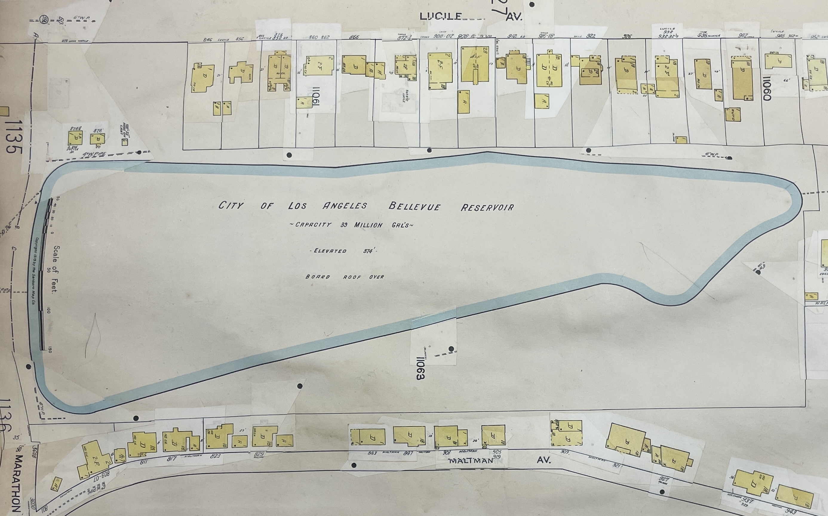 Water arrived via a brick conduit that branched off of the Crystal Springs conduit near the intersection of Hyperion and Riverside and then tunneled beneath the Ivanhoe Hills. The reservoir was forty feet deep and had a capacity of about 41,000,000 million gallons (roughly comparable to the Ivanhoe Reservoir’s 46,000,000 capacity and 33 foot depth). Treated water flowed out of the reservoir through a 48” main that ran beneath to the intersection of Hoover Street to 7th, where it joined a larger water main. By 1897, the Bellevue Reservoir provided almost half the city’s water supply.