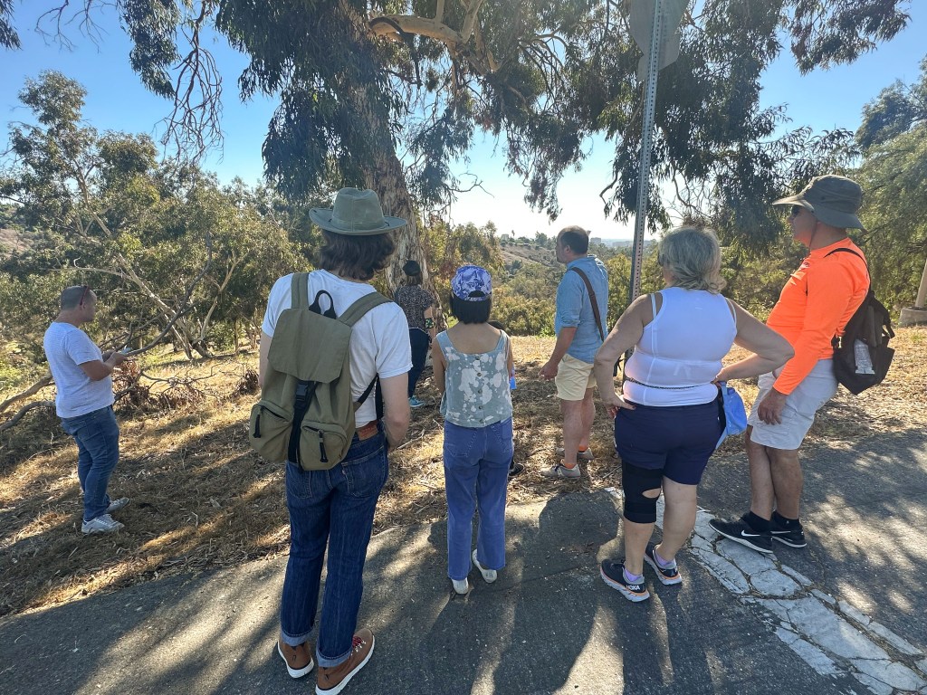 We stopped to rest at the top of the stairs. Some of the participants started to complain about the speed and difficulty of the walk — which, I believe, I had described as “moderately easy.” In the future, I will describe everything as two notches harder than it seems to me. I used to opportunity to point out some native trees. We then walked over to Park Drive and looked across Elysian Park to Downtown and Palos Verdes Peninsula. Barely visible in the hazy morning air was Peter Shire’s sculpture atop Angel’s Point, the Frank Glass and Grace E. Simons Memorial Sculpture (1994). Below us was the trail I used to walk with my friend, Natalya, that inspired me to explore and map the rest of Elysian Park.