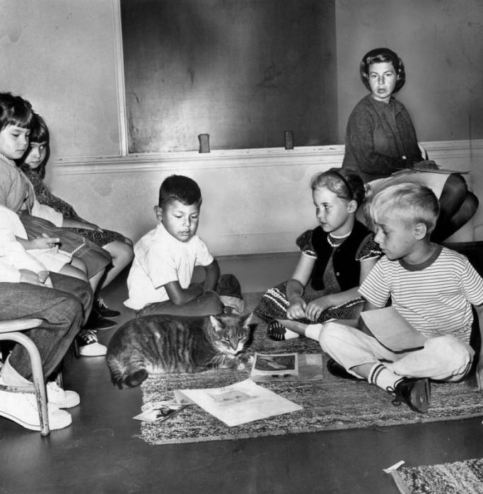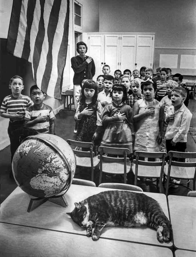 Sep. 14, 1964: The Elysian Heights Elementary mascot, “Room 8,” catches a cat nap while a first grade class performs the flag salute. (John Malmin / Los Angeles Times)