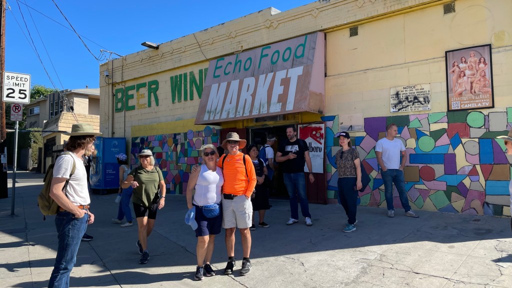 Back next to the former Zeller’s Grocery, Ayda had the idea of checking its wall for a ghost sign. If there ever was one, it was painted over, likely a long time ago. We couldn’t see much of anything over the fence. We began walking up Echo Park Avenue and I recognized a scent that had struck me in the same place a week earlier. At the time, I’d thought that it smelled like someone was baking a rhubarb pie — as unlikely as that is in generally rhubarb-indifferent Southern California. Others in the party correctly identified it as the scent of guava, currently in season.
