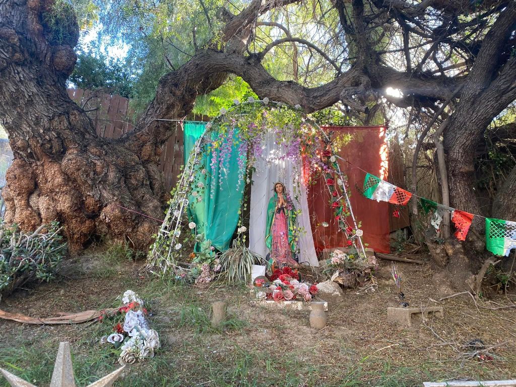 The next house on our exploration was up another dead-end. I suggested that anyone in need of a break take one in the shade of a pepper tree at the corner of Avon and Cerro Gordo streets. A couple of men sitting on a wall on Vista Gordo Drive asked us what we were up to. When told that we were exploring and on their street to see the Shire Art House, one jokingly suggested that we check out his house and described it as the one with the weeds in the yard.