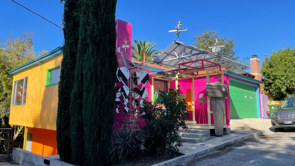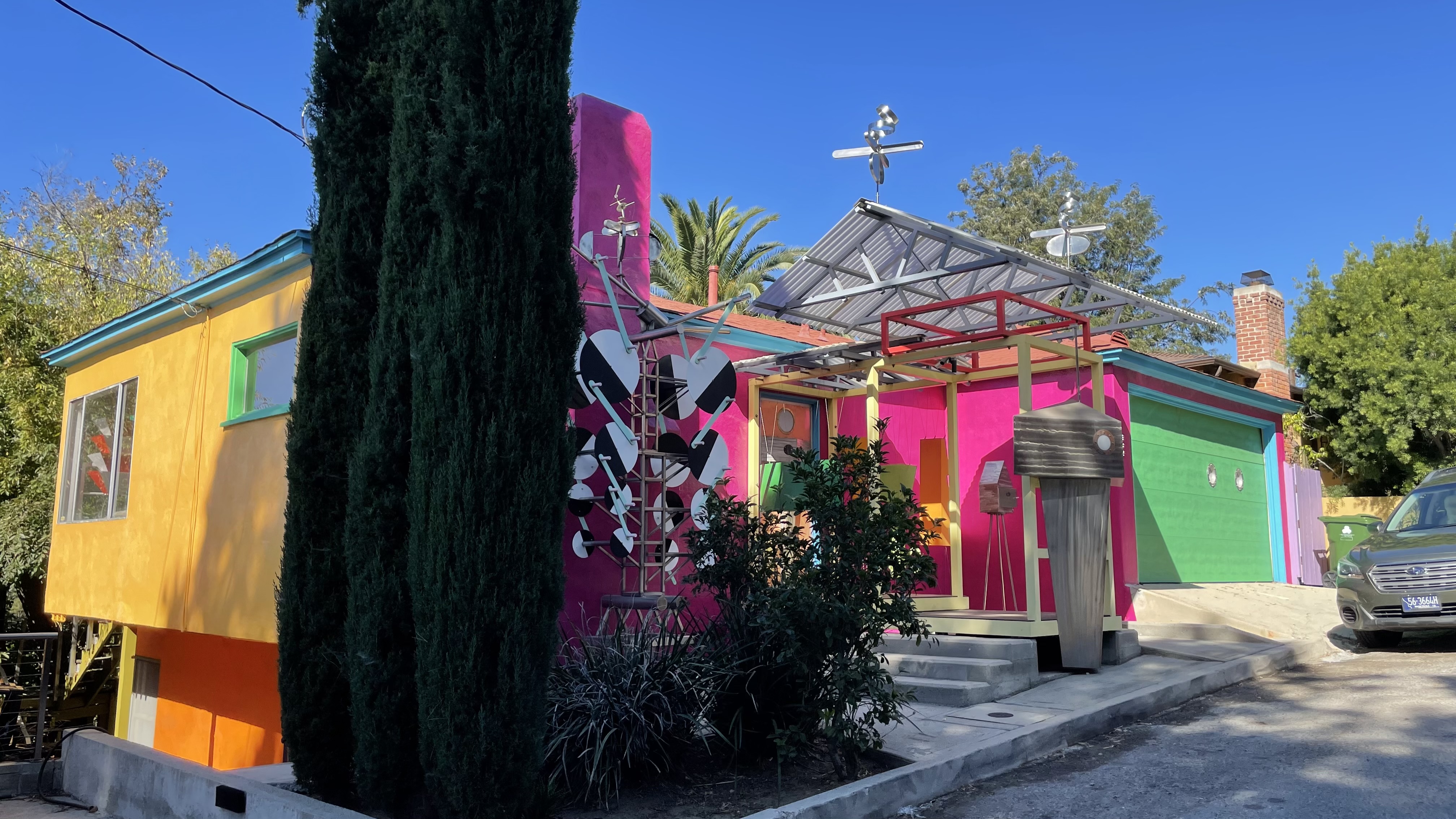 The Shire Art House is a Minimal Traditional-style home, built in 1938. The architecture isn’t what makes it exceptional, though, it’s the decoration, colors, and furniture visible inside. Peter Shire is an artist who was born in 1947 and associated with the Memphis Milano group. He also worked on the design team for the 1984 Summer Olympics, and Mike happened to be wearing T-shirt commemorating that event. Billy Shire, the artist/leatherworker and Luz de Jesus Gallery-founder who designed outfits for the New York Dolls and Elton John, was in the garage and closed its port-holed door.