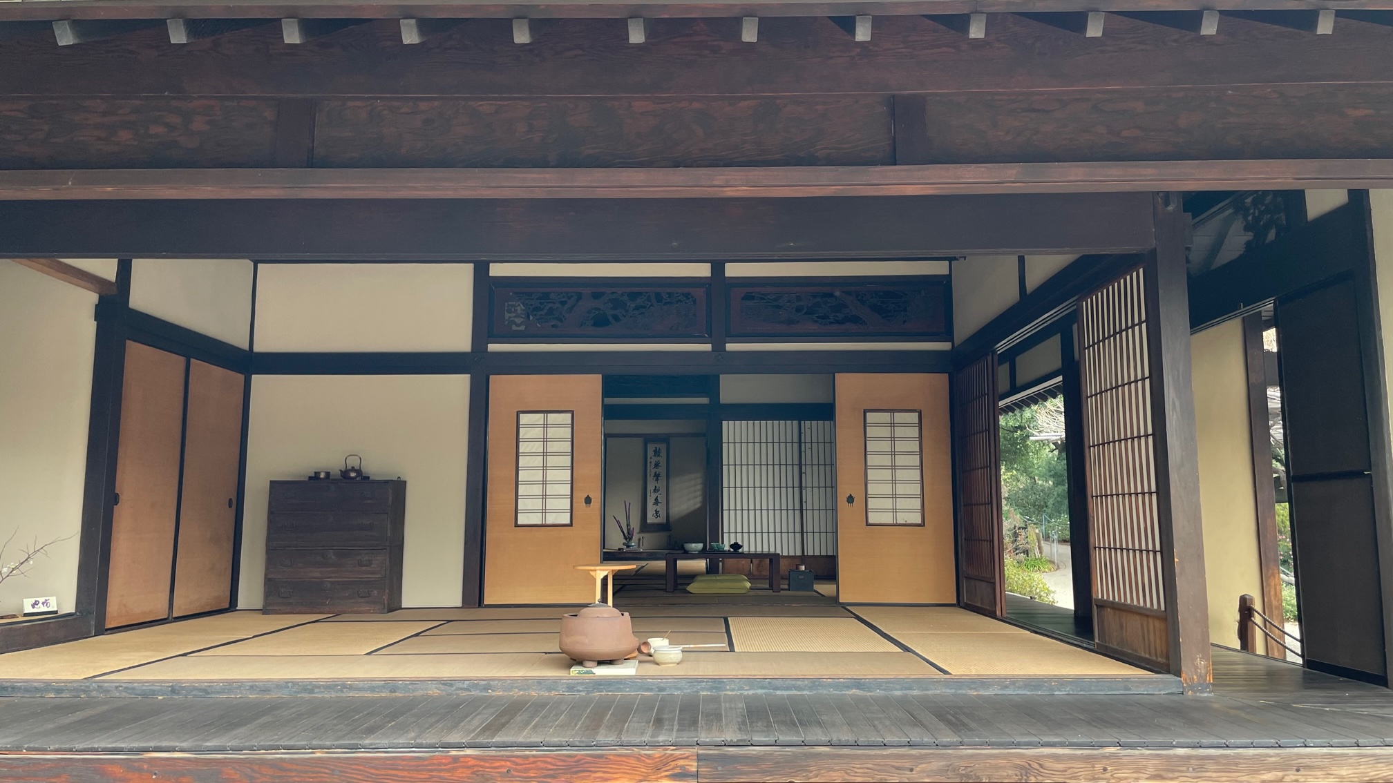 The Shōya House is a farm house/compound that was originally built around 1700. It was deconstructed, transported across the Pacific, and reconstructed. The plater walls, tatami mats, and other features are new but you can see insect damage in some of the wooden parts. Of course, there are smoke detectors and things like that to make it up to code. Still — at roughly three hundred years old, it’s withstood its share of earthquakes.