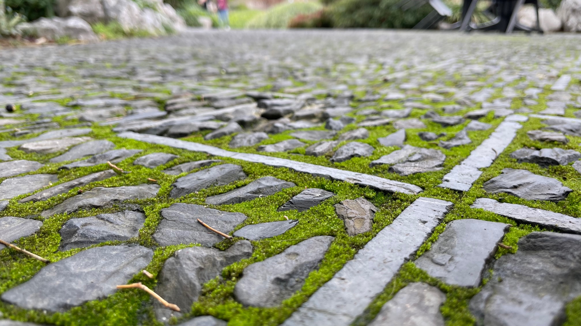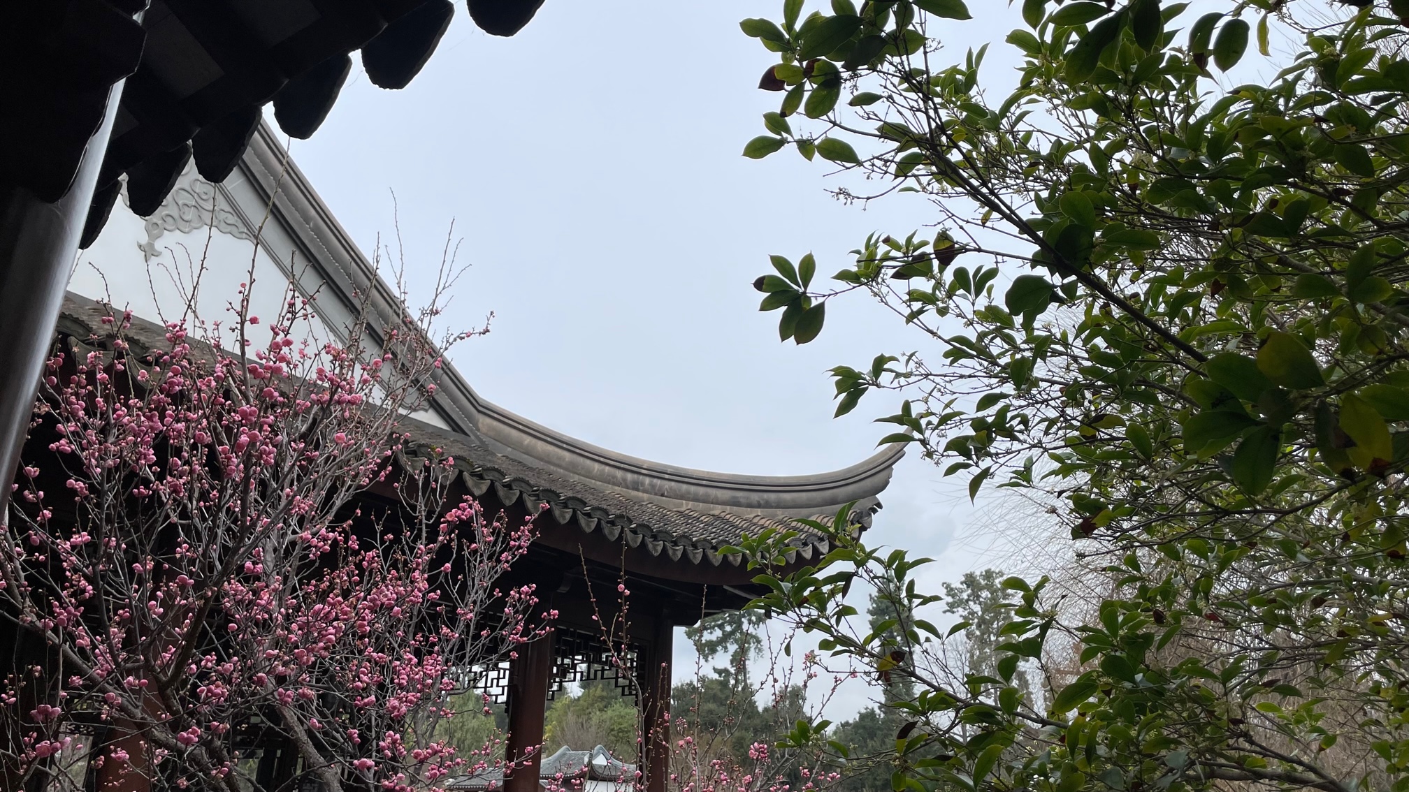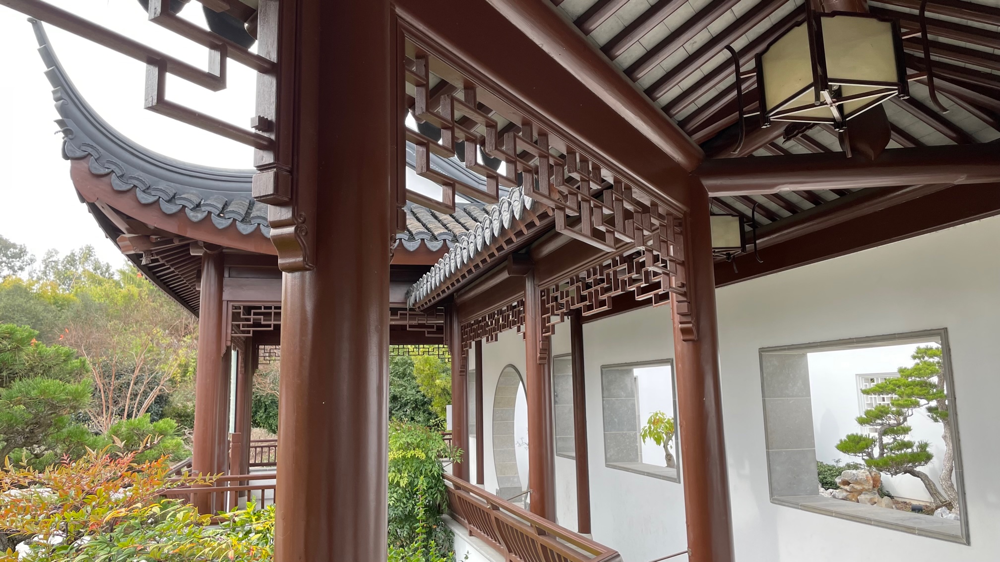 The Chinese Garden looks great, even as late winter transitions into early spring. There’s now lichen on rocks, moss growing on footpaths, and dead leaves on the roof tiles. Cones and flower petals litter the ground. Decaying plant material, volunteer plants, and spiders have settled into the nooks and crannies. Plants have had time to get established, to flower, and to fruit. Peeling paint was being repainted.