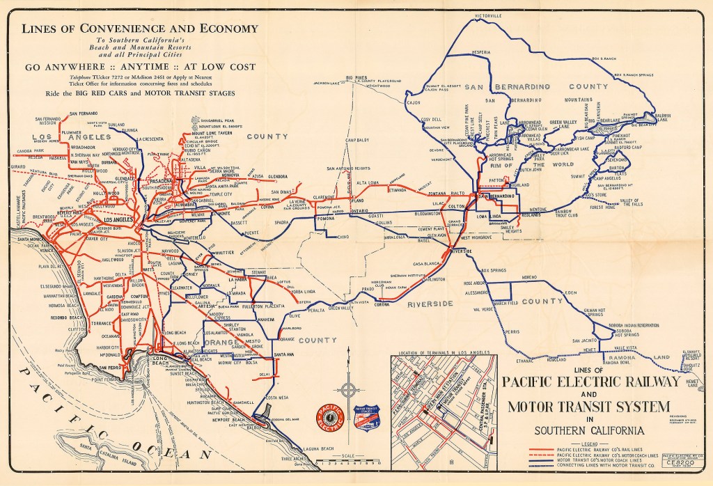PE’s red cars might be more iconic, but the yellow cars of Los Angeles Railway (LARy) enjoyed higher ridership. The red cars, which served four counties, were a bit like a combination of today’s Metro and Metrolink networks.
