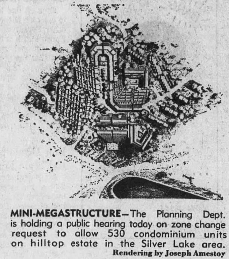 After Park Hill was abandoned, Cresticon Incorporated (a subsidiary of defense contractor, Litton Industries) stepped in with a proposal for 530 condominiums with rooftop gardens designed by architect Joseph Amestoy. It was to have been known as Silverlake Gardens. Amestoy called for the demolition of all three Garbutt-Hathaway homes, in which he saw “no architectural merit,” in order to accommodate automobile traffic. It was estimated that residents of the car-dependent development would require space for 1,400 automobiles making 4,200 weekday trips. This project was supported by both the Garbutt-Hathaway Hill Trust Associates and Silver Lake Residents Association… but was rejected by the city on 6 April 1977.