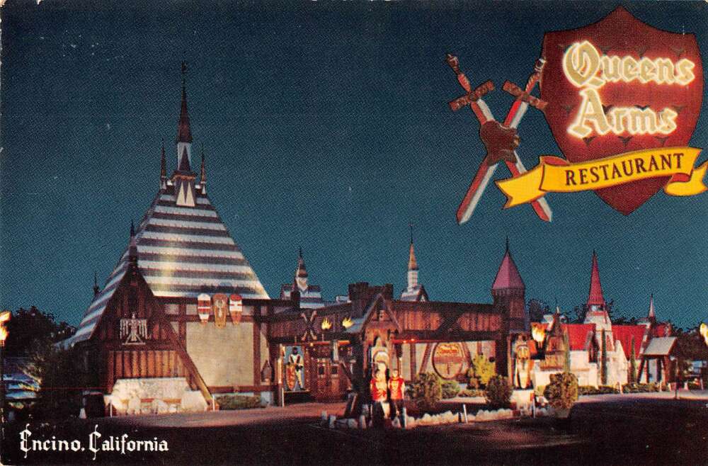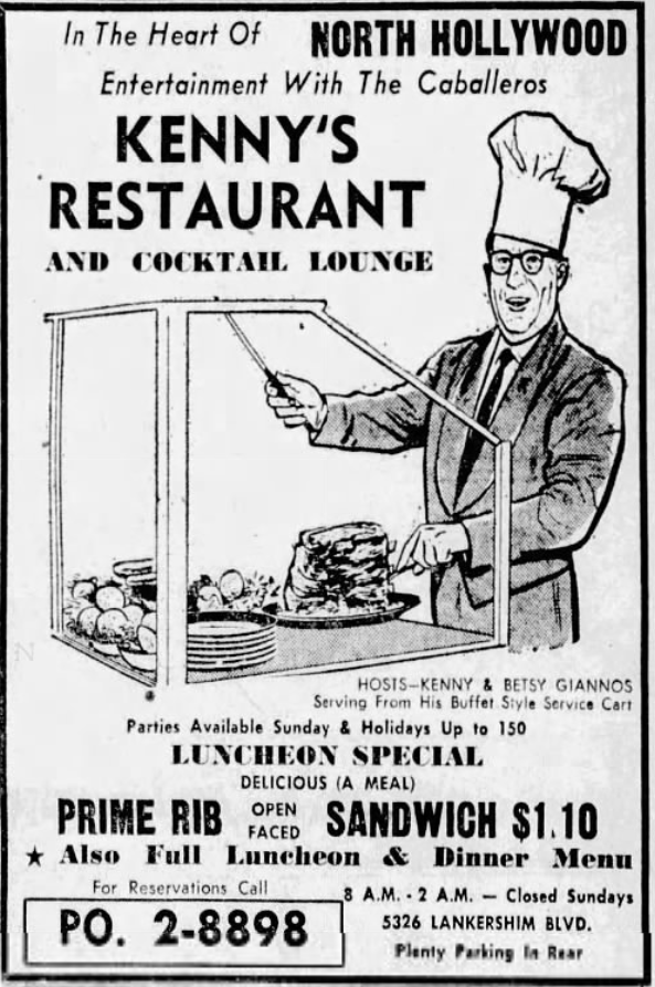 In the Valley, there were quite a few restaurants operated by Greeks — most of whom, it seems, were related to Chris Skoby, who came to Los Angeles from Kalamazoo during the Second World War to work as a flight instructor. None of their restaurants, as far as I now, actually served Greek cuisine. In 1946, Skoby’s Drive-In opened at Alameda and Victory in Burbank, which appeared on Happy Days as Arnold’s. They opened The Kings Arms in Burbank around 1954. In 1956, the Skobys and and Nick Bachakes opened The Queens Arms in in Encino (it closed in 1975). By 1956, Kenny Giannos had opened Kenny’s Restaurant & Cocktail Lounge in North Hollywood. In 1959, Skoby’s was taken over by Arthur and Gus Bachakes, who re-opened it as Arthur’s Restaurant. The Skobys opened their tenth restaurant, Skoby’s Bar & Grill, in Chatsworth around 1988. Chris Skoby died in 1998.