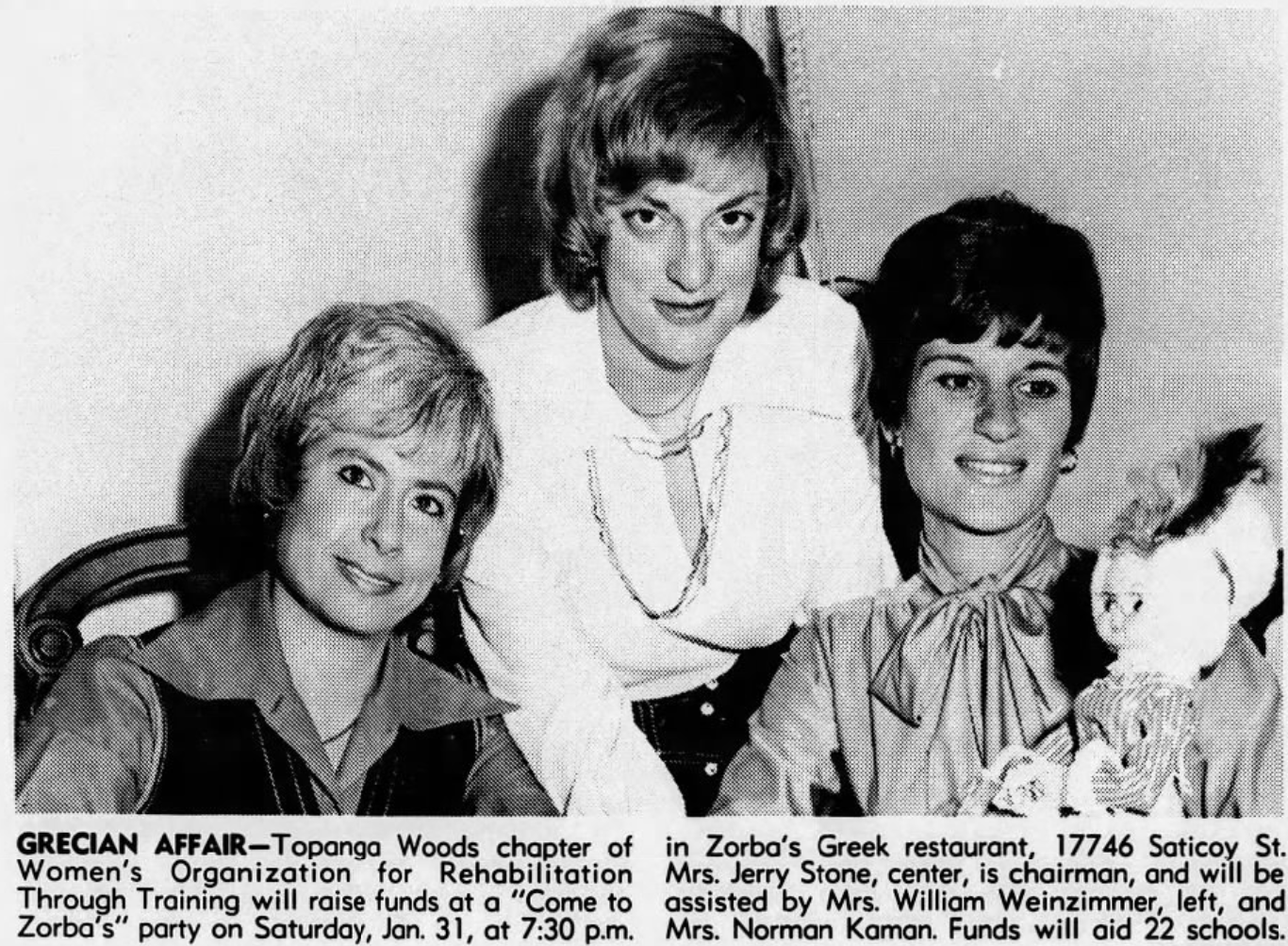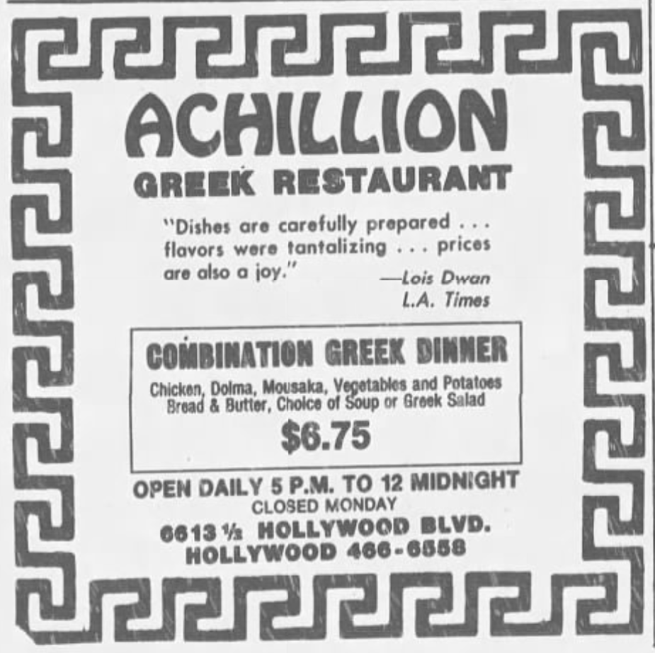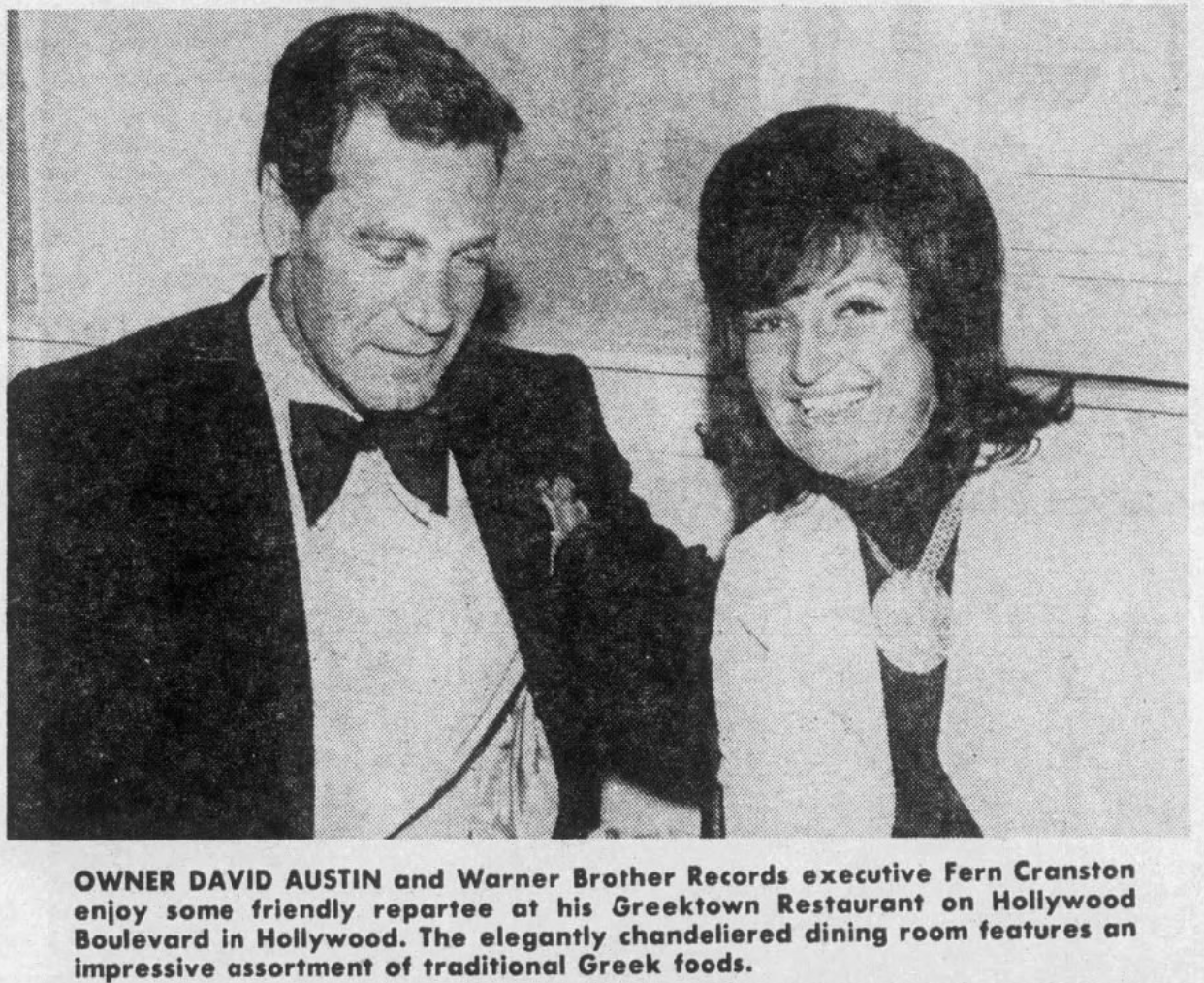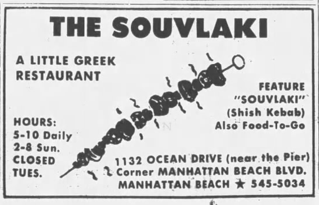 The first Greek restaurant in Orange County, Zorba’s, opened in Garden Grove in 1971 and was open at least as late as 1974.Mark Geronimos, brother of Souvlaki’s owner, opened The Cook Book in Hermosa Beach, in 1971. Its name was changed to The Corinthian in 1974. Yianni Gianakos opened Yiannis in Claremont around the same time, making it the first Greek restaurant in the Pomona Valley,. It remained open until at least 1985. Former Trojan footballer, John Papadakis, opened Papadakis Taverna in San Pedro in 1973, which was open until 2010. Restaurateur David Austin had a Greek restaurant on Santa Monica Boulevard called Greektown. In 1973, it moved to Hollywood Boulevard in Downtown. In 1977, he released an album on his own Greektown label called The Many Faces of Greektown, featuring himself, Dimitri Vamvakas, Nikos And Janette Koudas, Niko Selas, and Thomas Duckett. It had closed by 1979. The Gardens opened in Porter Ranch in 1974, and was then the only Greek restaurant in the Valley. Alexilion opened in Westwood in 1974 and was in operation as lates as 1978. Mykonos Greek Restaurant opened in Naples around 1976. Achillion opened on Hollywood Boulevard around 1978. By 1979, Erna Michaelidas had opened Skorpios in Westwood Village.