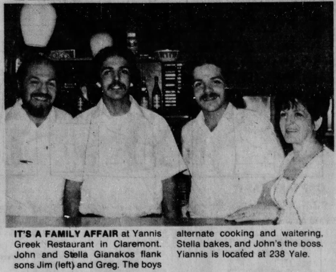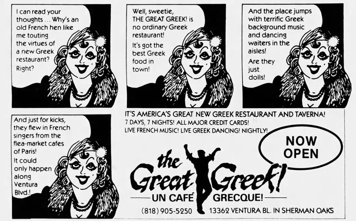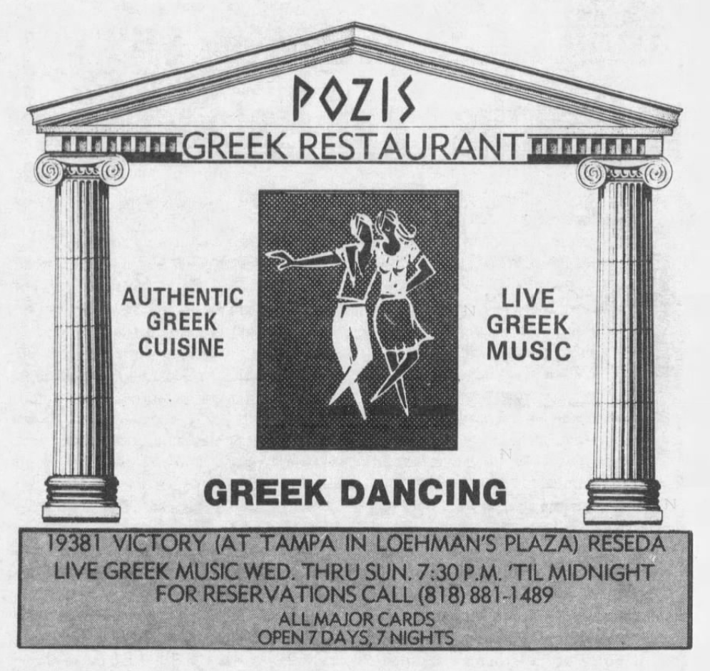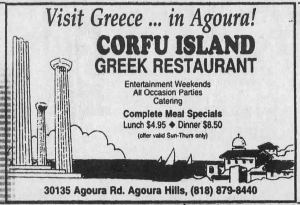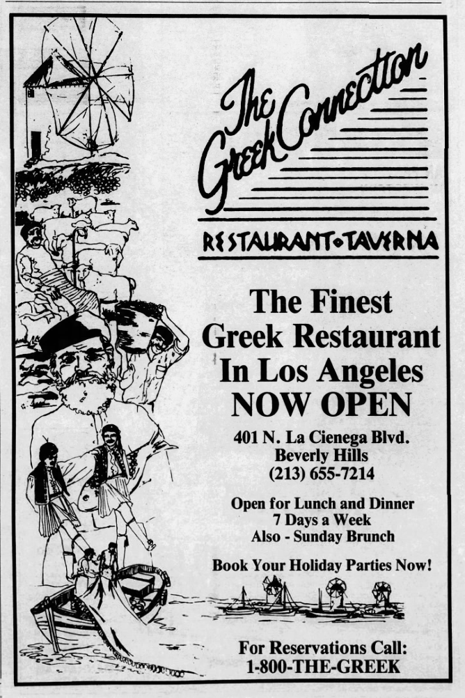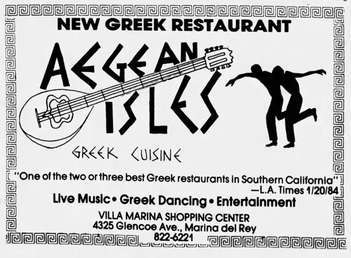 Around 1981, Orlando’s opened in West Torrance. Over in San Diego, in 1982, Haralabos Theodorpoules was arrested for burning Georgio’s Greek Village Restaurant to the ground. His half-brother, George Stravalexis, was the owner. In 1982, Cyprus-born Anna Vanero bought Chowder Call in Marina del Rey around 1981 and launched a Greek night in 1982. Around 1984, it became Aegean Isles (which remained open at least until 1987). A second Marina del Rey Greek restaurant, Dionysus, opened and closed in 1984. Around 1983, Fran O’Brien’s, in Santa Monica, became a Greek restaurant. In Santa Ana, George Smyrniotis opened The Golden Ram. Porto di Leone opened in Studio City around 1983. Sofi Lazaridis and Konstantin Konstantinides opened Sofi Greek Gourmet in West Hollywood around 1984. The Great Greek, still open in Sherman Oaks, opened in 1984. The Greek Connection opened near West Hollywood in 1984. A Taste of Athens opened in Pasadena around 1987. Pozis opened in Reseda around the same time. Mykonos was open in Silver Lake in 1987. Corfu opened in Tehrangeles around 1988.