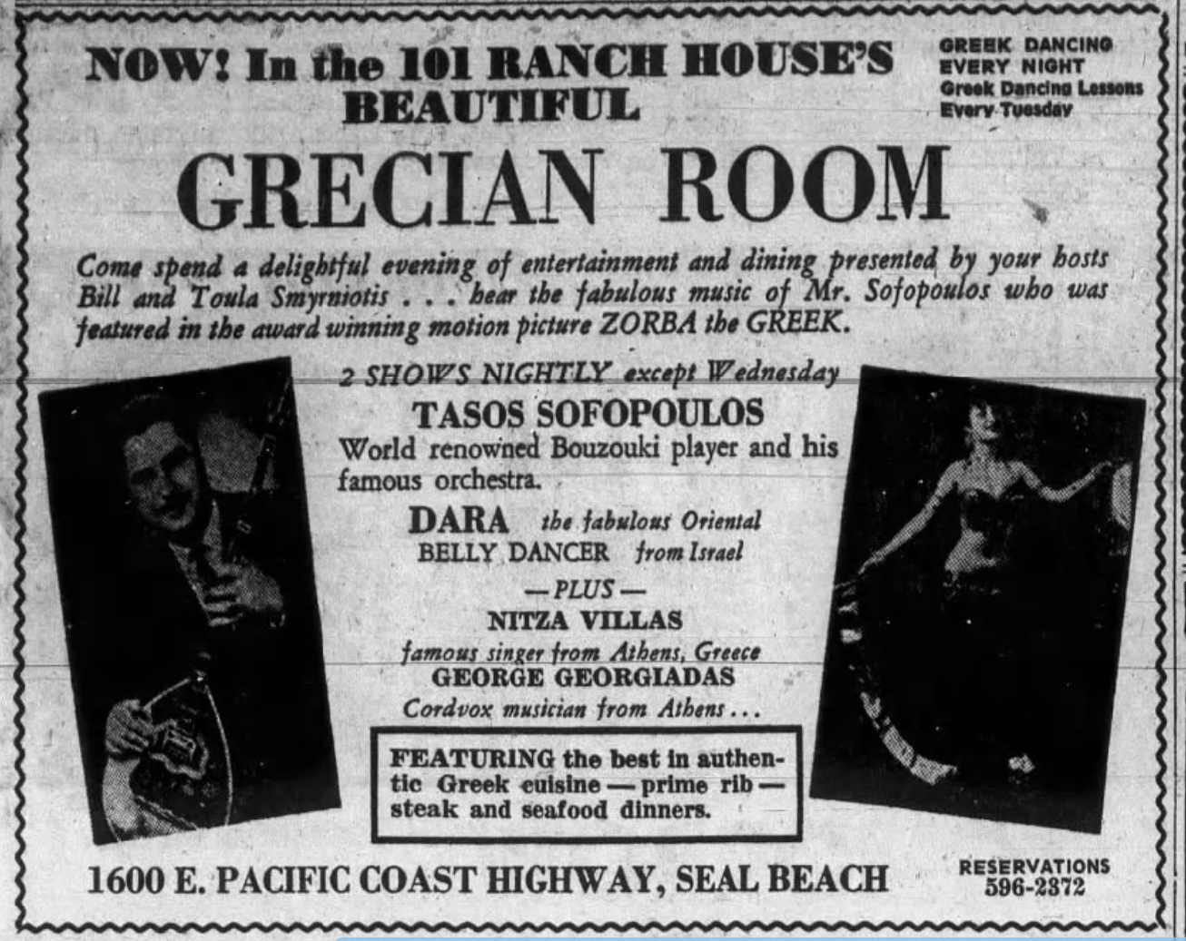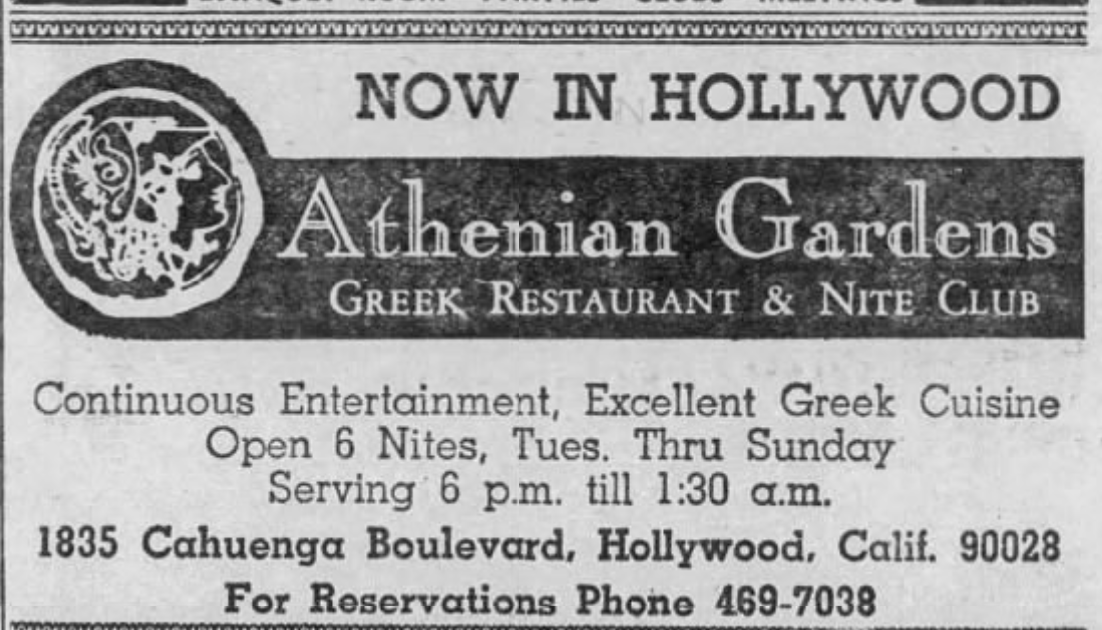 By the 1960s, Marathon was joined by several competitors serving Greek cuisine and, as often as not, entertainment in the form of music and Tsifteteli — the comeliness of dancers was often metnioned in reviews along with the quality of the food. By 1958, The Greek Village Restaurant was in operation in the Yucca Corridor and open at least as late as 1964. Also on Hollywood Boulevard, George and Helen Margaros opened The Torch around 1961. The Grecian Terrace opened down the street in 1962 and, around 1965, re-opened as Port Said, which remained in business at least until 1966. In 1965, there was a Greek restaurant called Athenia across the street from St. Sophia in Greek Town. The Grecian Room opened in Seal Beach‘s 101 Ranch House around 1967. Sophia Geronimos opened Souvlaki in Manhattan Beach around 1968. Athenian Gardens opened in the Yucca Corridor in 1969, with Chef Panagiotis Stravalexis running the kitchen. In 1983, a dance night called Acropolis, was launched there. Athenian Gardens was open at least as late as 1986. Tom Katsenes openend Galleon in Wilshire Center in 1969. It was still open as late as 1969, when Petros Pappas was hired as executive chef and, by night, it operated as Constandinas.