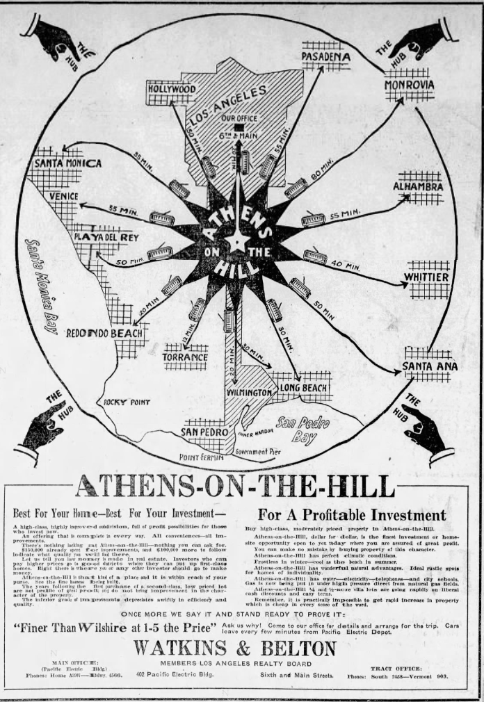 Los Angeles is home to three communities with nominal ties to Athens. I suspect, given that city’s classical associations and the era in which they were subdivided, that they may’ve been inspired by Abbot Kinney’s Venice of America and Arthur M. Parsons‘s Naples development, both developed in 1905. Strong & Dickinson‘s City of Athens Tract was subdivided in 1907. A few years later, in 1910, Watkins & Belton subdivided Athens-on-the-Hill. The community of West Athens came to be colloquially so known around 1912. East Athens was mostly built-out in the 1940s. Athens’s Athens Park was dedicated in 1943. In 1990, in an effort to increase property values that I don’t begin to understand, East Athens was renamed Rosewood. Unlike Venice and Naples, however, none of the communities named after Athens seem to have made any effort to evoke Greece in any way. West Athens, perhaps, is best known for being the filming location of the hood comedy, Friday.