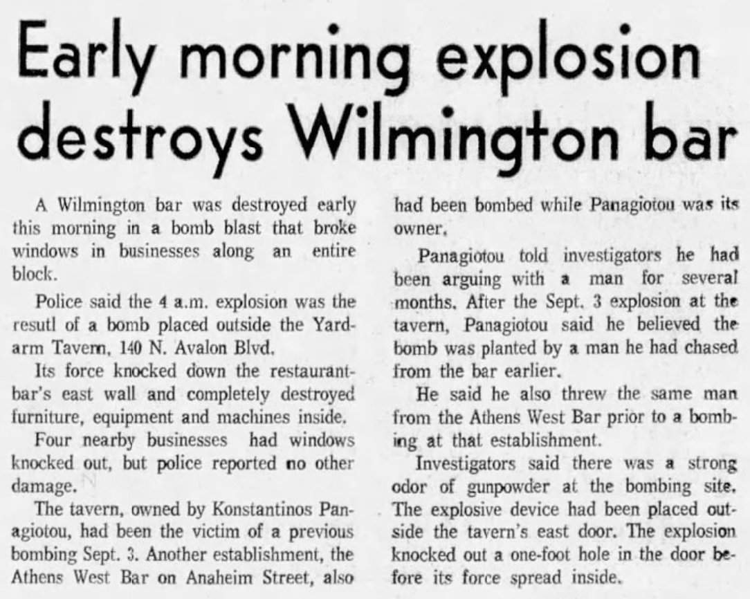 In the 1960s, there were two bars in in the Harbor District neighborhood of Wilmington owned by two brothers, Konstantinos and Panagiotis Panagiotou, that were mysteriously targeted with a bombing campaign. In June 1969, Panagiotis‘s Athens West was bombed. In September, Konstantinos‘s Yardarm Tavern was bombed with enough dynamite to blow out the windows of four neighboring businesses. It was bombed again in early October. Understandably spooked, Konstantinos announced that he was out of the bar game. The following March, a car driven by Panagiotis went into the bay. Inka Modovitch, and an unnamed woman, were fished from the water by a Long Beach Marine diver. Only Konstantinos escaped death and swam to shore but was in shock. In the 1980s, he returned to the bar game, opening The Spot, with his wife, Maria, in neighboring San Pedro. Konstantinos died at the age of 53 in 1990.