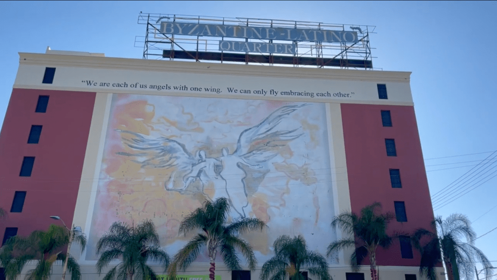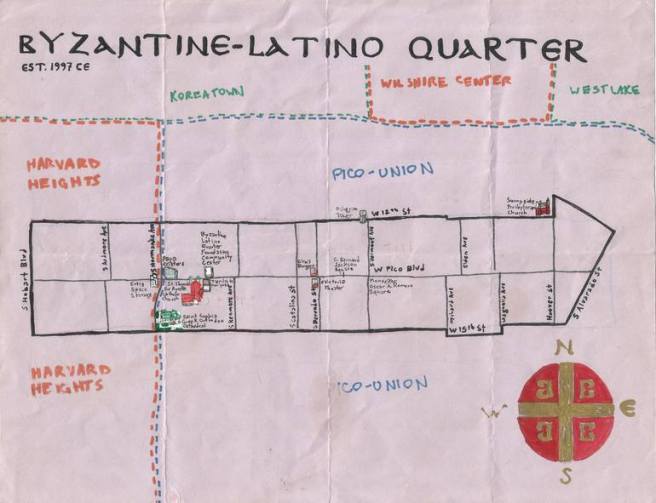 Greek businesses and residents in the area used to be far more numerous. According to researcher and former LA Greek Festival-chairman, Ted Pastras (1944-2013), there were, at one time, 65 Greek owned businesses in and around Greek Town. I, so far, have had less luck. Readily accessible information about Greek Angelenos is truly lacking. If you have the names and address of more (anywhere in the entire region), please let me know so that I can add them to the Greek Los Angeles Map. In 1997 – long after nearly all Greeks had left the area, by then mostly Central American – a Business Improvement District (BID) was formed there called the Byzantine-Latino Quarter BID.