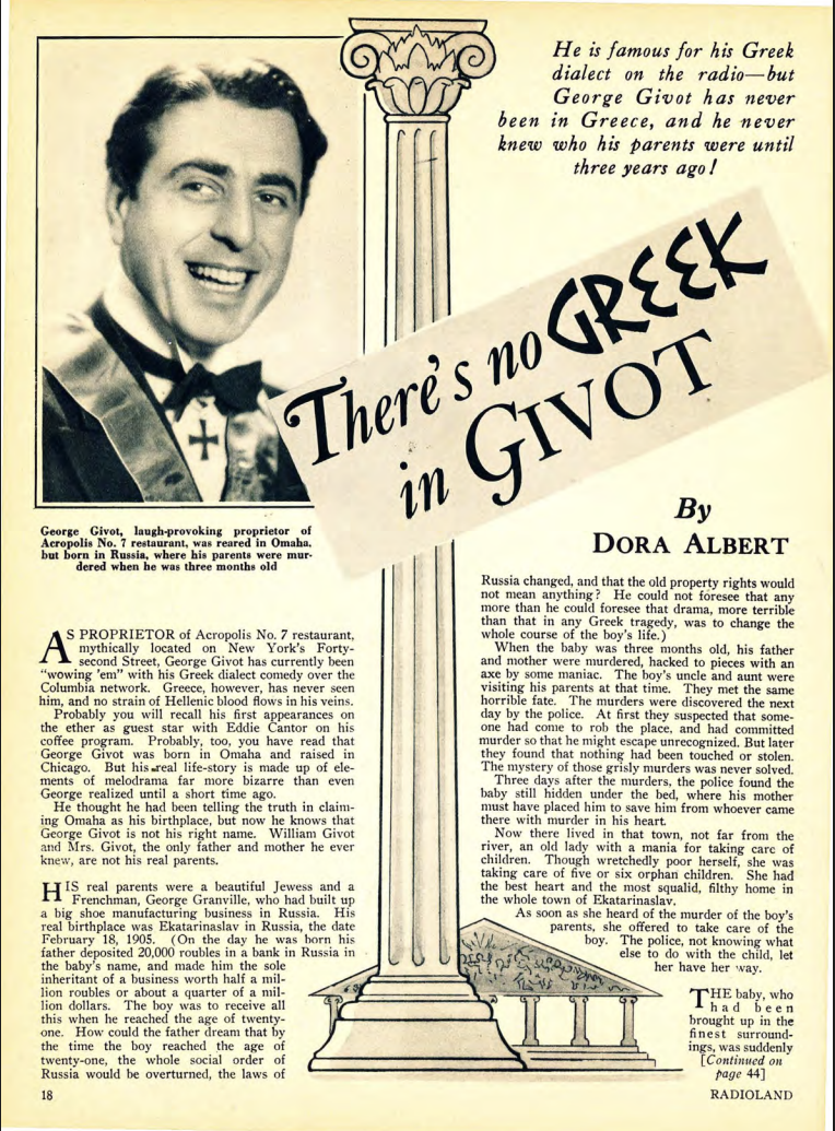 Ukrainian American vaudevillian George David Givot — the Greek Ambassador of Good Will — reportedly picked up some Greek whilst working as a soda jerk in Omaha. In Hollywood, much of his career was based on portraying Greek characters, which he did in films including Gobs of Fun (1933), The Chief (1933), Howd’ Ya Like That? (1934), Roast Beef and Movies (1934), Ed Sullivan’s Headliners (1934), and Ain’t Misbehavin‘ (1955). He lived in Tarzana before retiring to Palm Springs, where he died in 1984.