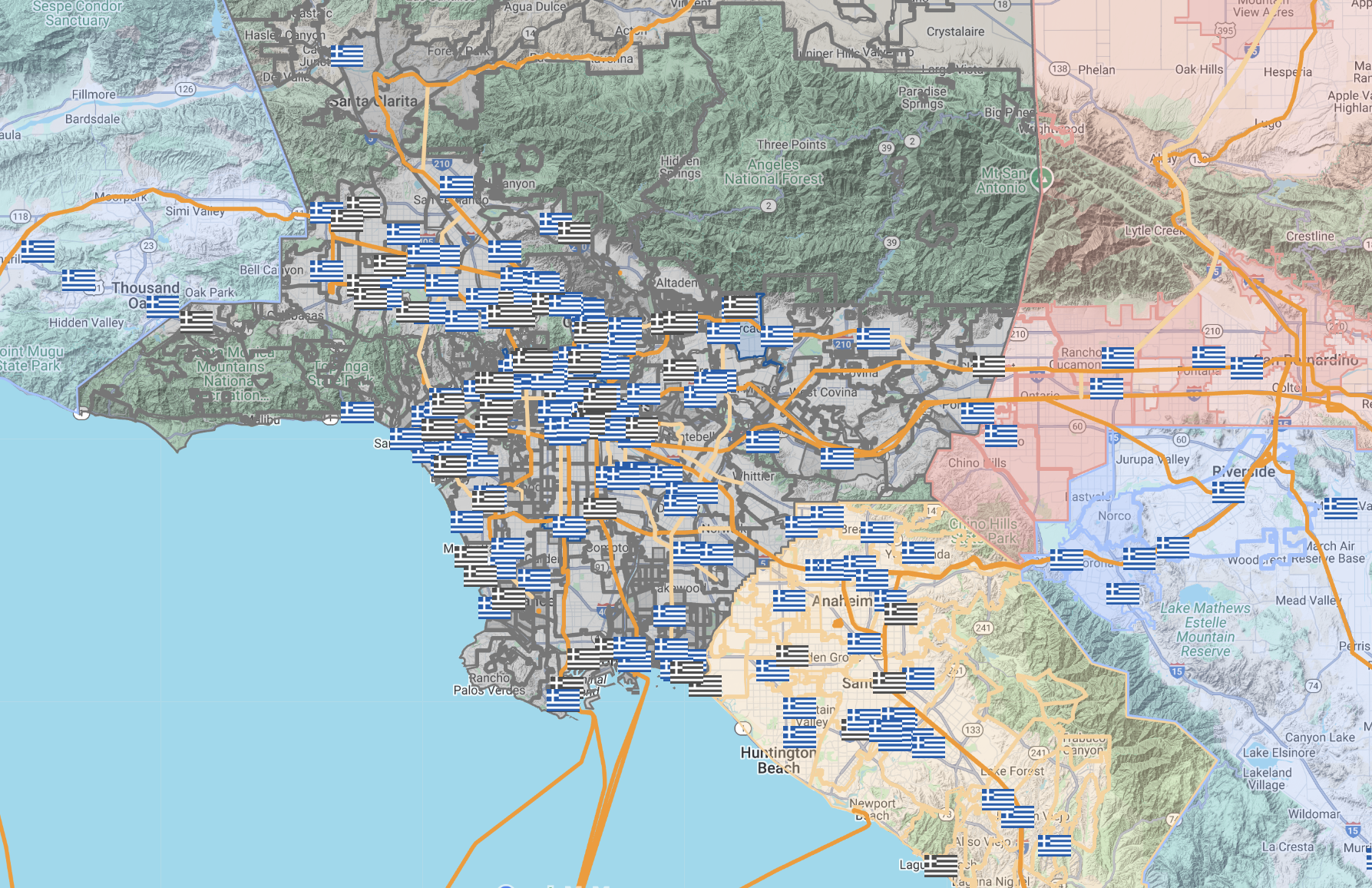 The American town with the largest Greek population, percentage-wise, is Tarpon Springs, Florida, where roughly one in four residents is Greek. The Greekest towns in California, meanwhile, are Monte Sereno and Graeagle — two places even less familiar to me than either Nepal or Tajikistan. The metropoleis with the largest numbers of Greeks, in descending order, are New York City, Boston, Chicago, and Los Angeles. A 2020 American Community Survey counted 52,416 Greek Angelenos, about 5,484 of whom were born in Greece.