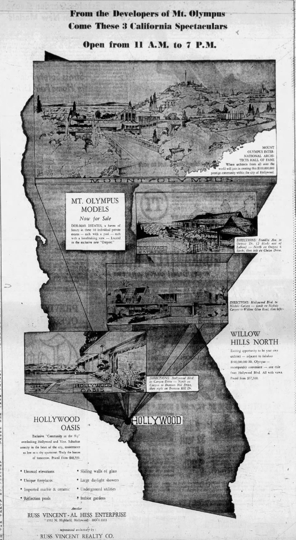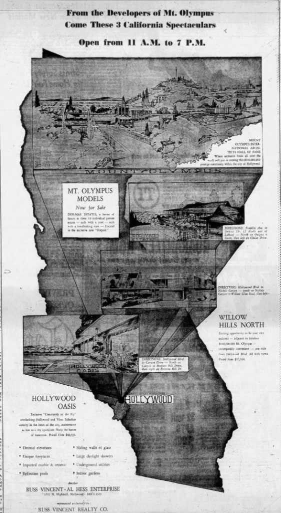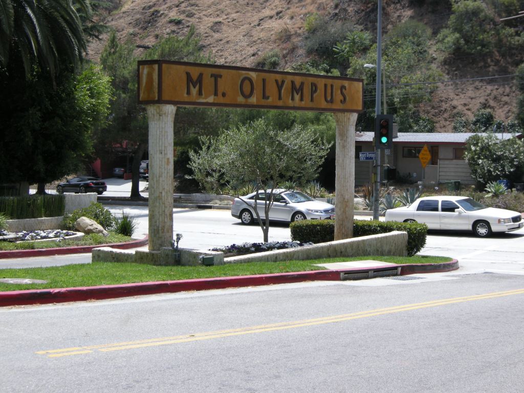 The same cannot be said of Mount Olympus. Filmmaker-turned-developer Russ Vincent and Al Hess premiered their project consisting of 700 homes located in the rugged upper Hollywood Hills, in 1963. The subdivision’s entrance sign is only half-heartedly pretentious. There is faux-Greek lettering the columns on which it is borne are not especially Greek-looking. The Greek theme seemingly begins and ends there.