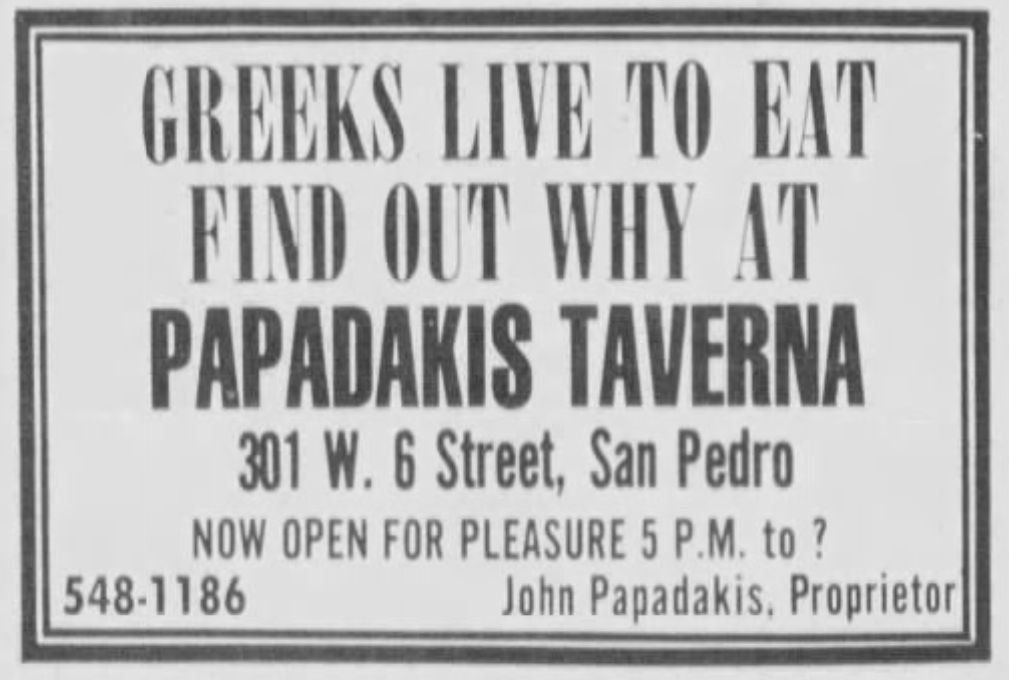 The most famous Greek Restaurant today, and for decades now, is Papa Cristo’s. The business began with Sam Chrys, a Greek immigrant born in Turkey in 1900. In 1943, he married Annie Yordon, the Fresno-born daughter of Greek immigrants. Their son, Chrys S. Chrys, was born in 1945. In 1948, Sam Chrys founded C & K Importing. In 1962, the Chryses relocated, like many Greeks, to the South Bay — Rancho Palos Verdes in their particular case. In 1968, Chrys expanded the family business into a restaurant, Papa Cristo’s. Sam Chrys died in 1988. Around 1990, the business began catering and expanded into Papa Cristo’s Catering & Greek Taverna. Papa Cristo’s is closing permanently on 4 May, which is Star Wars Day but also, I suspect, Papa Cristo’s 80th birthday. Hopefully he enjoys a well-deserved retirement but I hope that his namesake restaurant lives on — in some fashion — in more than just our collective memories