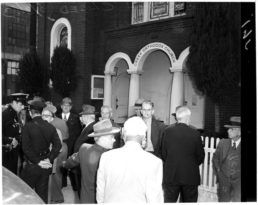 The first Greek Orthodox services were held at a warehouse at 720 North Broadway in 1906. By 1908, they’d relocated to a building at 240 South Anderson Street in the Russian Flats section of the Eastside. That 14 June, a group of Greeks took out a state charter to formally organize the Greek Community. The board of directors was composed of Bill Tsagalakis, Fotis Tsoumas, George Alexakis, George Mantas, George Vacrinos, Gust Chicos, Gust Legakis, Gust Markopoulos, Gust Picoulas, Jim Carellas, John Heliotis, Louis Alexakis, Peter Sakellaris, Thomas Vacrinos, and Tsoumas Vacrinos. The first permanent leader of the church was Papa Gerondeos Koutouzis. The first church, O Evangelismos Tis Theotokou (aka “St. Julian”) was dedicated in 1912 and located in the Garment District until it was closed with an injunction in May 1953.