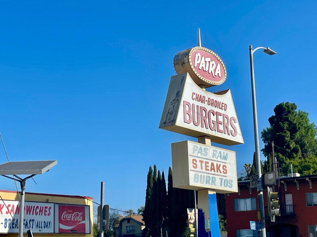The heyday of diners and drive-ins was the 1950s and ‘60s – which was also the heyday of the burger stand; and Greek immigrants were also instrumental in establishing those in Los Angeles. Besides their Greek names, another hint of many of these stands’ Greek American origins lie in the menus that often feature pastrami burgers and burritos alongside, occasionally, a Greek item or two. The pastrami burger is a Los Angeles invention. Pastrami originated in Turkey and was brought to the historically Jewish Eastside via immigrants from Eastern Europe. In the East, pastrami is usually served on rye. In Los Angeles, it’s often sandwiched between two hamburger buns, dressed with mustard and pickles, and served with a side of fries. By the time of the Jewish exodus from the Eastside, many of the region’s Latinos had acquired a taste for pastrami while, at the same time, burritos were added to the menu where they joined cheeseburgers and other mid-20th century favorites. Thus you have places in Boyle Heights like Jim’s Burgers, founded by James Angelopoulos in 1957, and George’s Drive-In, founded by George Sideris in 1966 or ‘67. Patra was founded in 1976.