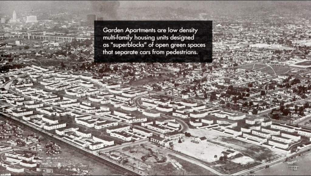The first serious effort to catalog garden apartments was launched in 2012. The Architectural Resources Group prepared a report titled Garden Apartments of Los Angeles for the Los Angeles Conservancy. Filmmaker Maya Santos and her Form Follows Function media crew crafted a documentary about three garden apartments titled Villages in the City: Garden Apartments of Los Angeles. It all culminated in 2014 at an event called We Like Garden Apartments!