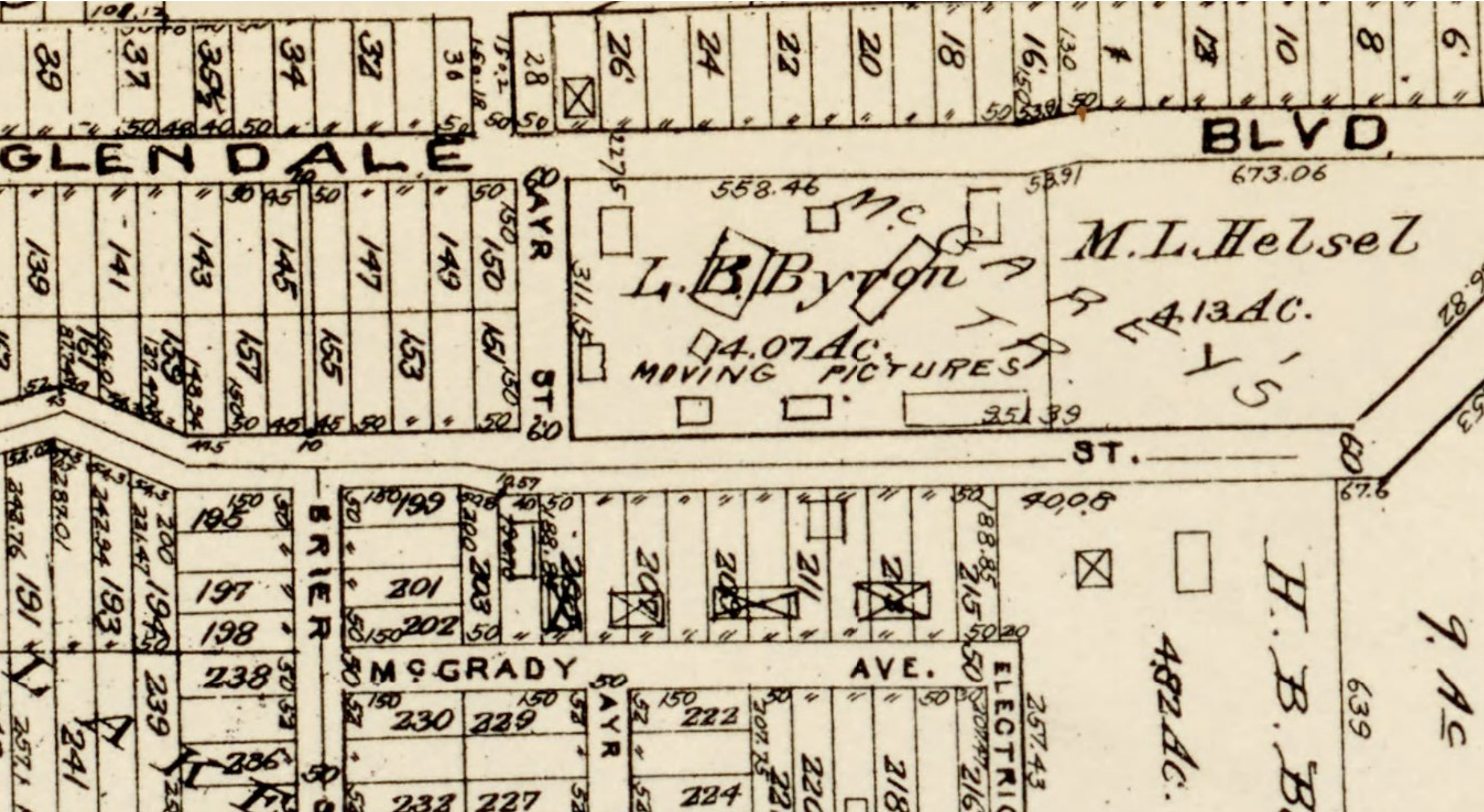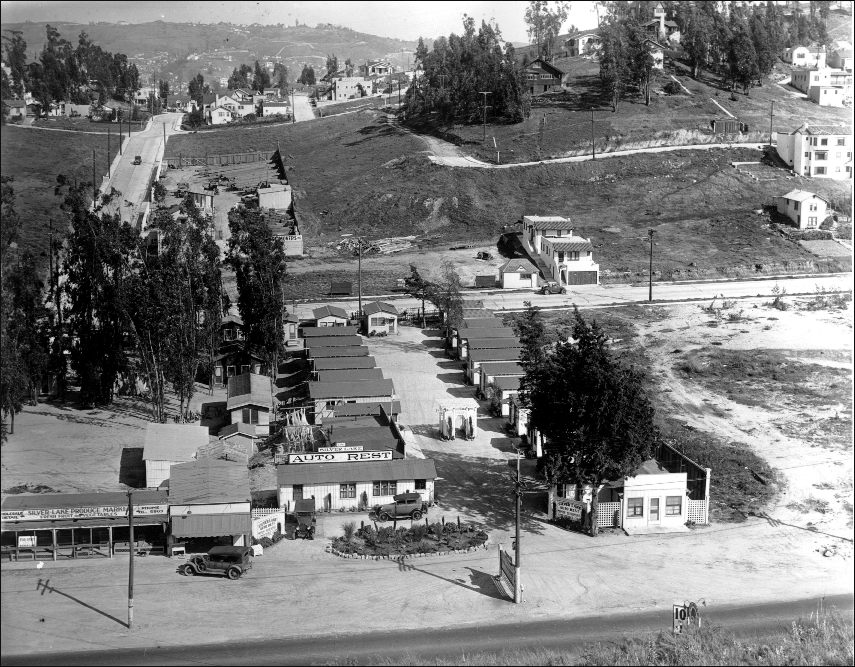 The northern half of Mrs. Garey’s Tract was then owned by M. L. Helsel. Heslel was a real estate developer. He was awarded $2,500 for the loss of an arm resulting from a house moving accident, after which he offered to part with his other arm for the same price. Instead, he parted with his life in 1925, when he was hit and killed by a motorist as he strolled through Belvedere Gardens. After his death, his property was turned into an auto court (a sort of motel with cabins) named Silver Lake Auto Rest – and the Silver Lake Produce Market. In 1966, the former auto court and market were redeveloped as the shopping center still there today – although in place of a Whole Foods and CVS there was then a Hughes Market and a Sav-On Pharmacy.