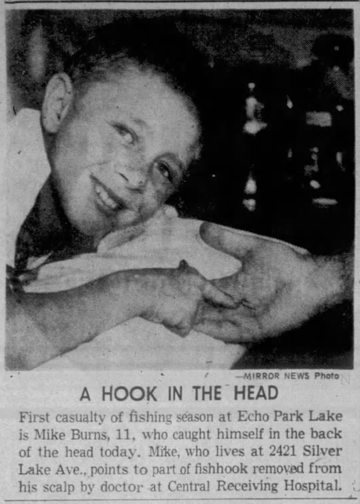 Usually a search through the newspaper archives for any multi-dwelling residence – especially a larger one like a garden apartment complex – yields all sorts of colorful results. Silver Lake Garden Apartments are, in this regard, rather an exception. The only incident concerning an inhabitant that seems to have been deemed newsworthy involved an eleven year old boy named Mike Burns. In 1953, he got a fish hook stuck in his skull over at Echo Park Lake and was covered in the pages of both The Los Angeles Mirror and The Los Angeles Times.