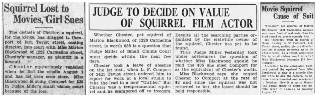 Comport was living at 2127 Teviot Street when, in 1927, he was sued by Miss Marion Blackwood. Blackwood was the manager of a squirrel named Chester who, it was hoped, would pursue an artistically and financially rewarding career in film. It may sound strange to modern Silver Lakers, accustomed as we are to the daily sight of red squirrels, but our bushy-tailed neighbors were a comparative rarity back in early 20th century Los Angeles. The non-native mammals arrived in Los Angeles in 1904, when veterans brought them to the Sawtelle Veterans Home as pets. Blackwood and Chester both lived mere blocks from the Veterans’ Home, in neighboring Brentwood Heights. Chester escaped from Comport’s and was never re-apprehended. Blackwood sued Comport for $35 (roughly $650 adjusted for inflation).
