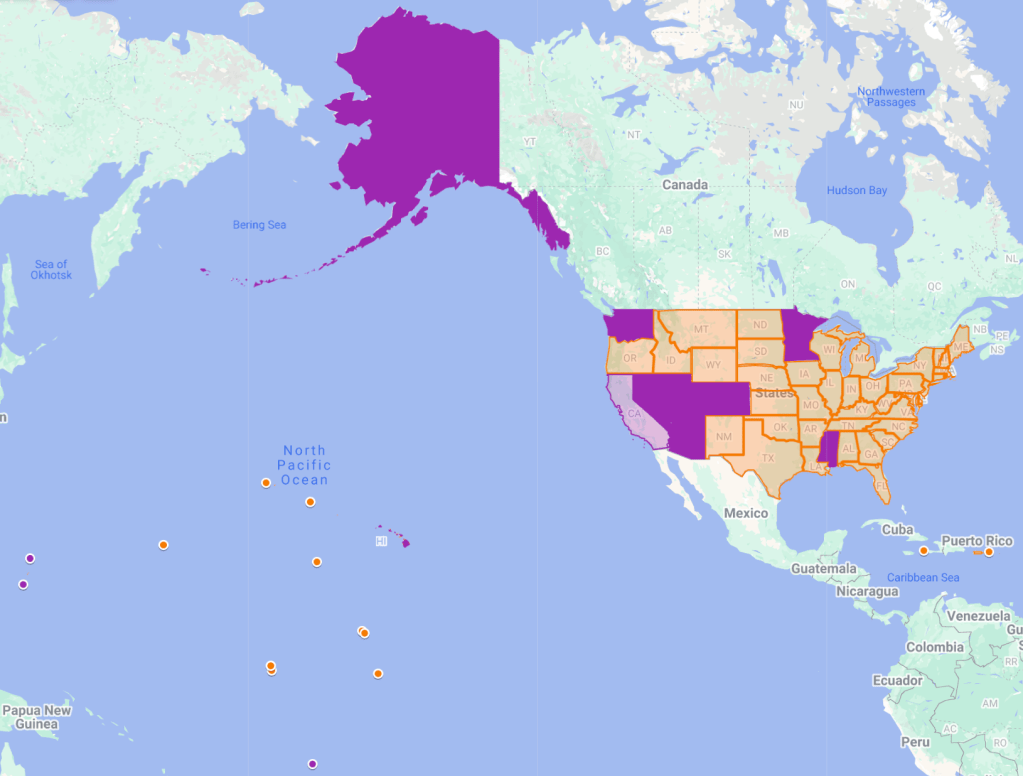 Guam is the southernmost island in the Mariana Islands that was settled by Micronesian Chamorro people some 4,000 years ago. Today, there are nearly as many Filipinos as Chamorros on the island. Guam is, notably, the furthest west point in the US – so far west, in fact, that it’s on the other side of the International Date Line, meaning it’s also the furthest east – the basis of its slogan “Where America’s Day Begins.” Guam is also notable for having a higher rate of enlistment in the US armed forces than any other state or territory.