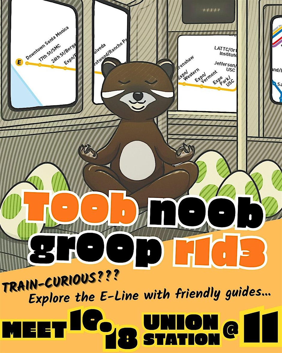 Although I do find both the northern and southern portions of the A Line scenic, in very different ways, I reckoned that it’s the E Line I would take someone on. My co-host, Kyle, also chose the E Line. So when my friends, Kate and Muffy, told me that neither of them have ever taken the train but wanted to — I thought we should take that line. Fellow Nobody Drives in LAer, Ivy Kwok, was also down to co-host these “tube newbs.” Then, I decided (with Muffy and Kate’s permission) to expand it into a group ride for other transit newcomers and anyone else who fancies it.. Even if you’re an E Line conductor who’s travelled this route every day since it began operation, you will doubtless find new information in this guide. So whatever your experience level, come with us on the ride and, if you don’t mind, reserve a free “ticket” on the Eventbrite page so we have a rough idea of who and how many to expect. All aboard!