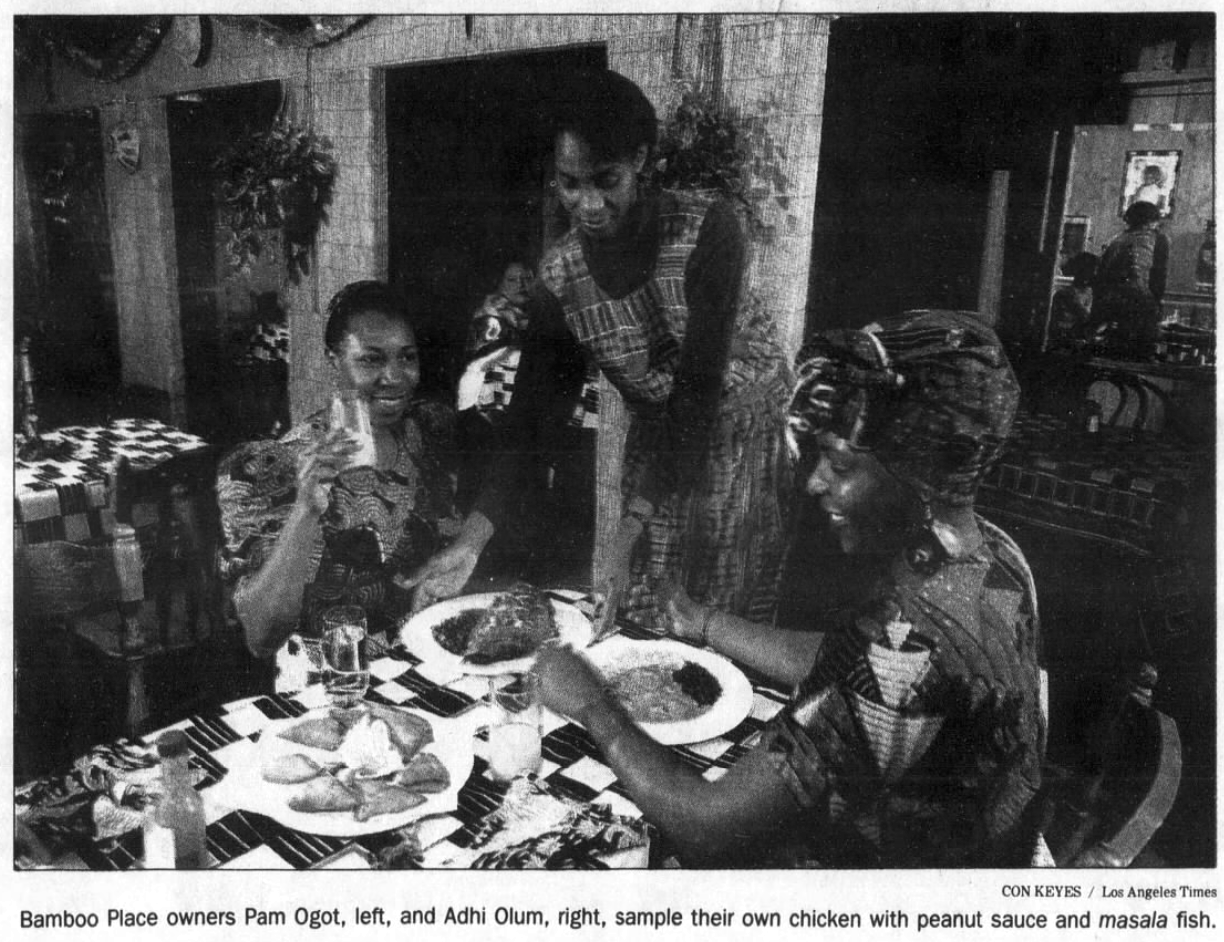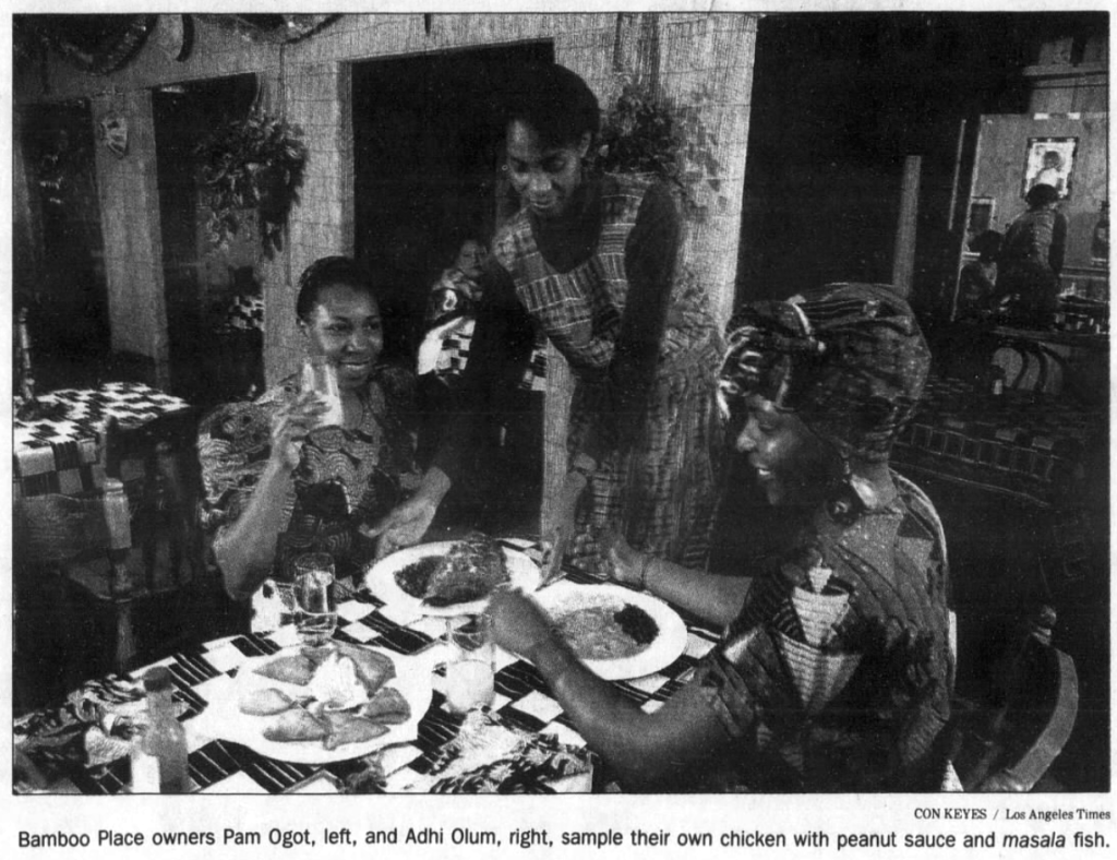 The first Kenyan restaurant in Los Angeles was, likely, Bamboo Place — which was open on Rodeo Road (now Obama Boulevard) by 1994, when it replaced Alex’s Southern Cuisine. Before that, it was another East African place, Queen of Sheba. Bamboo Place hosted a music and dance night called Le Pacha Club. It seems to have closed in or not long after 1996.