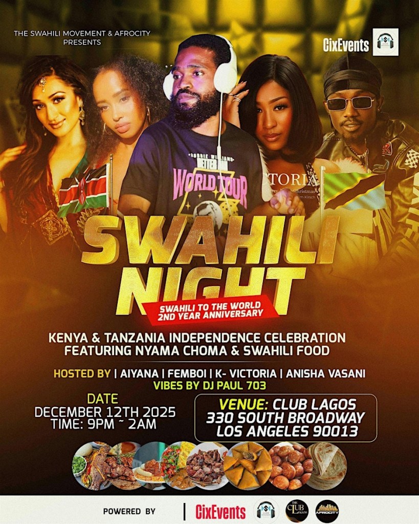 Kenyan festivals and observances within the Kenyan community of Southern California: National holidays in Kenya itself include the aforementioned Jamhuri Day (12 December), Madaraka Day (1 June, marking the day Kenya attained internal self-rule in 1963), and Mashujaa Day (Heroes’ Day, 20 October).Events in Southern California around this time often involve social gatherings, music, dancing, and food. In the past, the Kenyan Consulate has hosted Kenya Cultural Festival (July 2023) and the Kenyan Cultural Night (15 March 2024). There’s also the ongoing series, “Afrobeats Takeover Hollywood,” that takes place at Dragonfly Hollywood and Jungle Hollywood. The next one, tomorrow, is for Jamhuri Day. And tonight, Swahili Movement is hosting their second annual Swahili Night in Downtown Los Angeles.