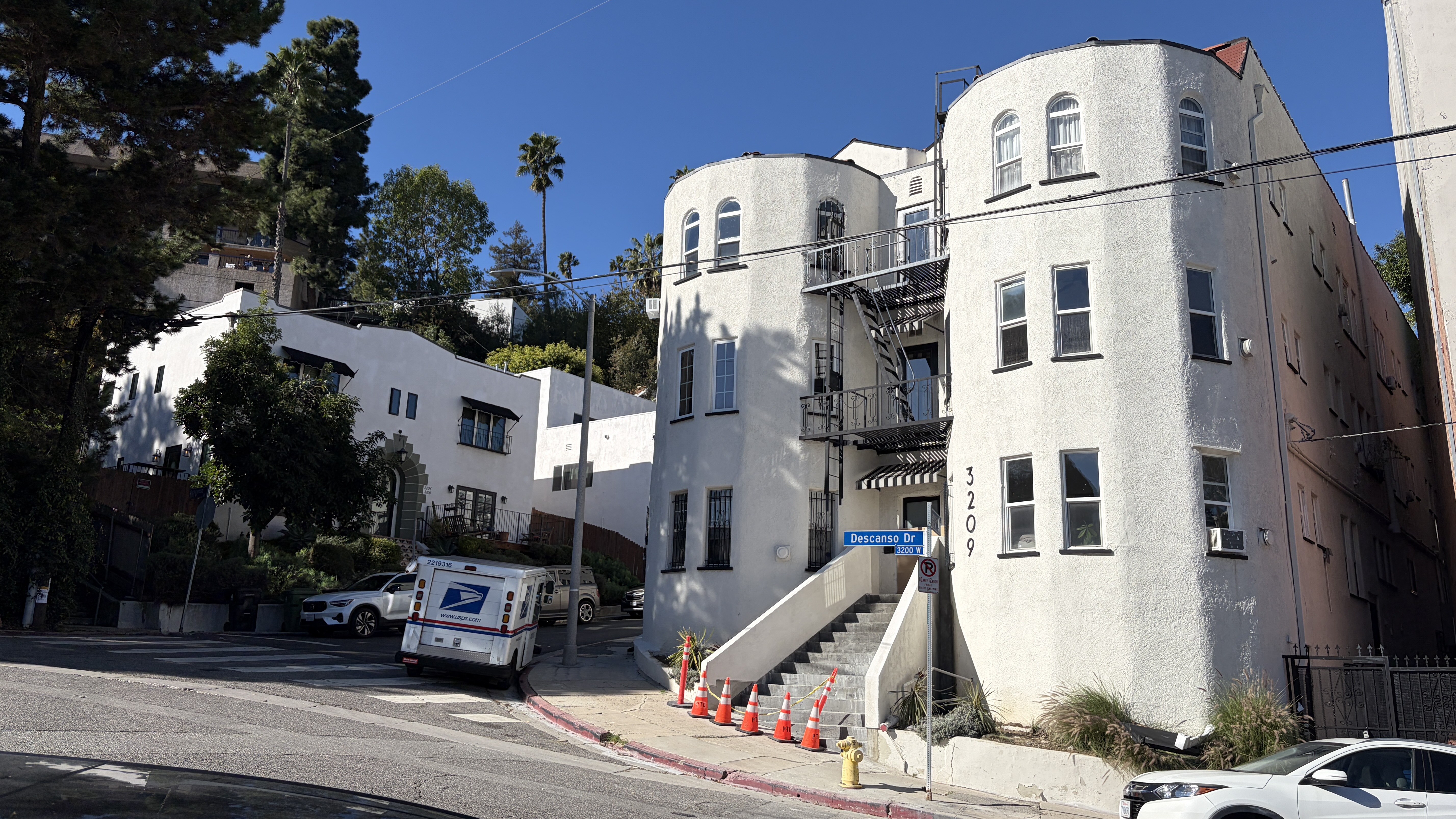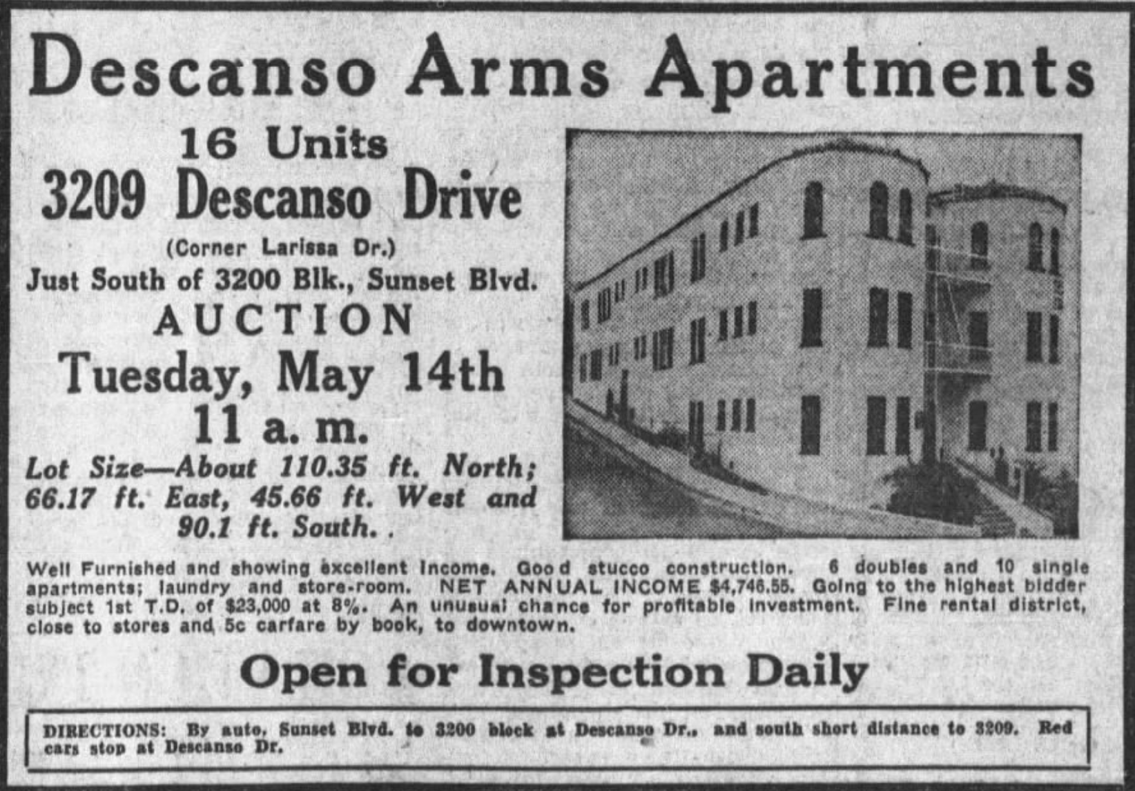 The sixteen-unit, four story Descanso Arms opened next door to the Albert Lee, at 3209 Descanso Drive, in 1928. In 1945, a tenant and ex-marine named Jobert Williams took it upon himself to dress as a woman, lure men they called “mashers” who targeted and annoyed women. When a teenager said to one of them, “hello honey,” Williams and his cohort, Robert Blanton, attacked the teen – an act for which they were celebrated in The Los Angeles Times. The victim of their attack was booked by the police on suspicion of burglary.